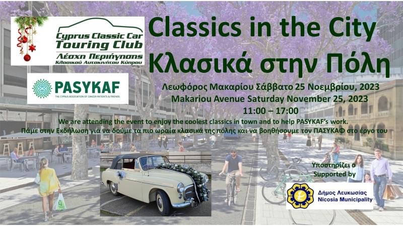 Η Λέσχη Περιήγησης Κλασικού Αυτοκινήτου Κύπρου διοργανώνει την εκδήλωση «Κλασικά στην Πόλη-Classics in the City» το Σάββατο 25 Νοεμβρίου 2023 από τις 10:00 μέχρι τις 17:00 στη Λεωφόρο Μακαρίου.