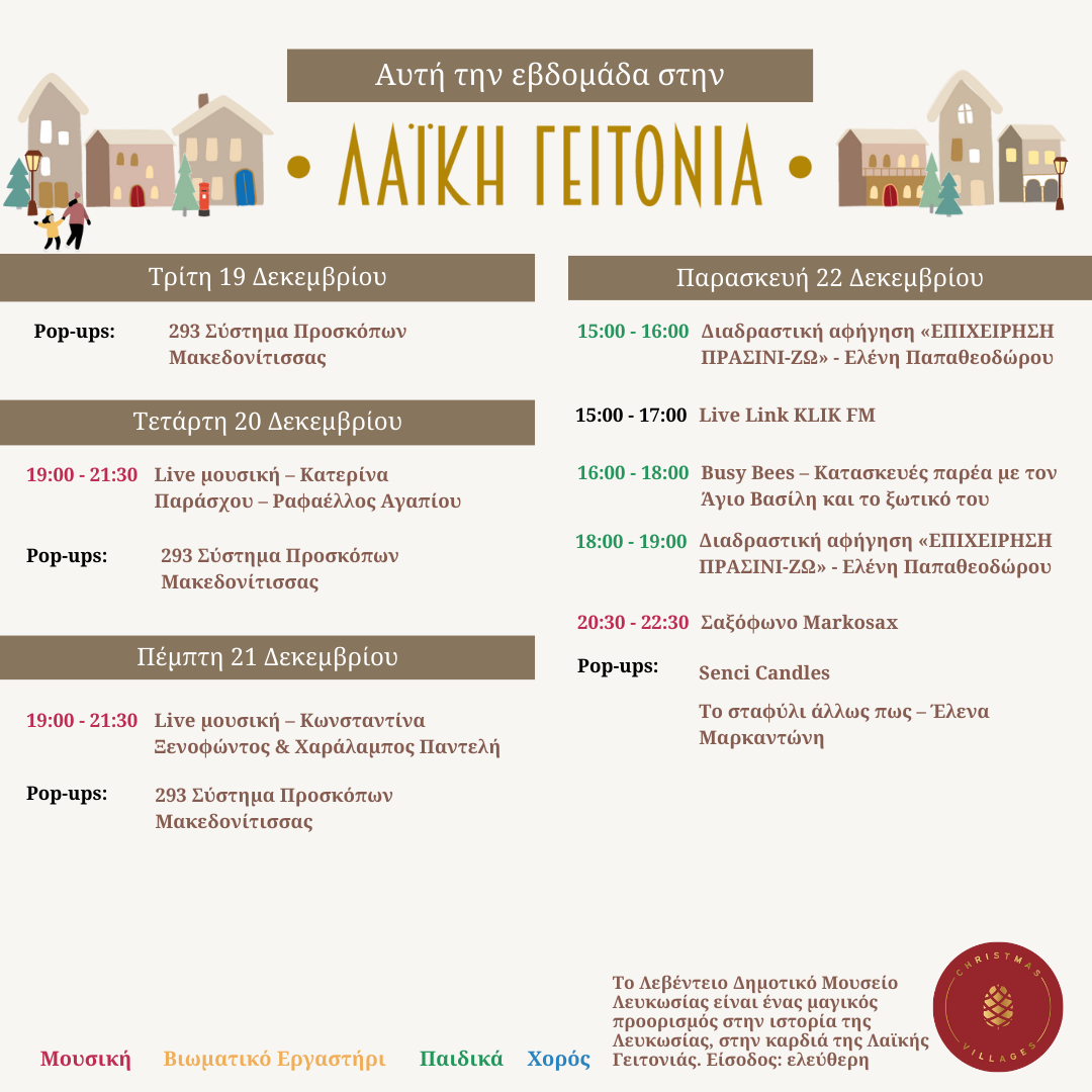 Εκεί, θα απολαμβάνετε ένα πλούσιο πρόγραμμα, με μουσικές και χορωδίες, ζεστό κρασί και άλλα ροφήματα. Θα δείτε τα παλιά αρχοντικά που έδωσαν στέγη σε καταστήματα με χειροτεχνίες, βιωματικά εργαστήρια, θα πάρετε ιδέες για δώρα, θα επισκεφτείτε πωλητήρια παραδοσιακών προϊόντων του τόπου μας, χώρους για πίτσα, σουβλάκι, σούπες, γλυκά και νόστιμο street food. Ένα πανέμορφο αρχοντικό έγινε το εργαστήριο του Άι Βασίλη που φιλοξενεί δραστηριότητες για τα παιδιά ενώ οι μεγάλοι μπορούν να απολαύσουν το ποτό τους στο μπαρ που έχει στηθεί στη Λαϊκή Γειτονιά, συντοφιά με live μουσική αλλά και τραγούδι. Μία όμορφη οικογενειακή βόλτα που θα προσφέρει ψυχαγωγία, διασκέδαση και παράλληλα θα σας φέρει σε επαφή με τις τέχνες, την λαογραφία και τον πολιτισμό της Κύπρου.