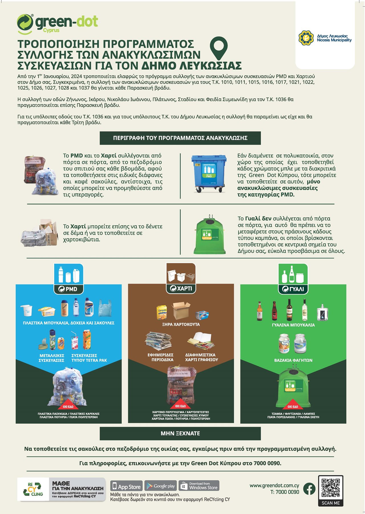 Ιανουαρίου 2024 τροποποιείται ελαφρώς το πρόγραμμα συλλογής ανακυκλώσιμων συσκευασιών για το Δήμο. Η συλλογή των ανακυκλώσιμων συσκευασιών για τους ταχυδρομικούς κώδικες 1010, 1011, 1015, 1016, 1017, 1021, 1022, 1025, 1026, 1027, 1028 και 1037 θα γίνεται κάθε Παρασκευή βράδυ, αντί κάθε Τρίτης βράδυ.
