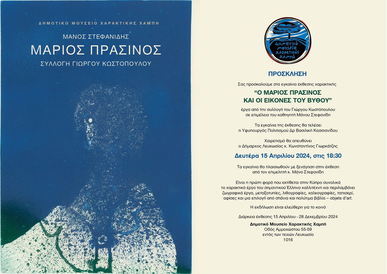 Την Δευτέρα 15 Απριλίου στις 18:30 εγκαινιάζεται από την Υφυπουργό Πολιτισμού Δρα Βασιλική Κασσιανίδου η έκθεση Χαρακτικής στο Δημοτικό Μουσείο Χαρακτικής Χαμπή στη Λευκωσία με έργα του μεγάλου Έλληνα ζωγράφου και χαράκτη Μάριου Πράσινου. Χαιρετισμό θα απευθύνει ο Δήμαρχος Λευκωσίας κ. Κωνσταντίνος Γιωρκάτζης.