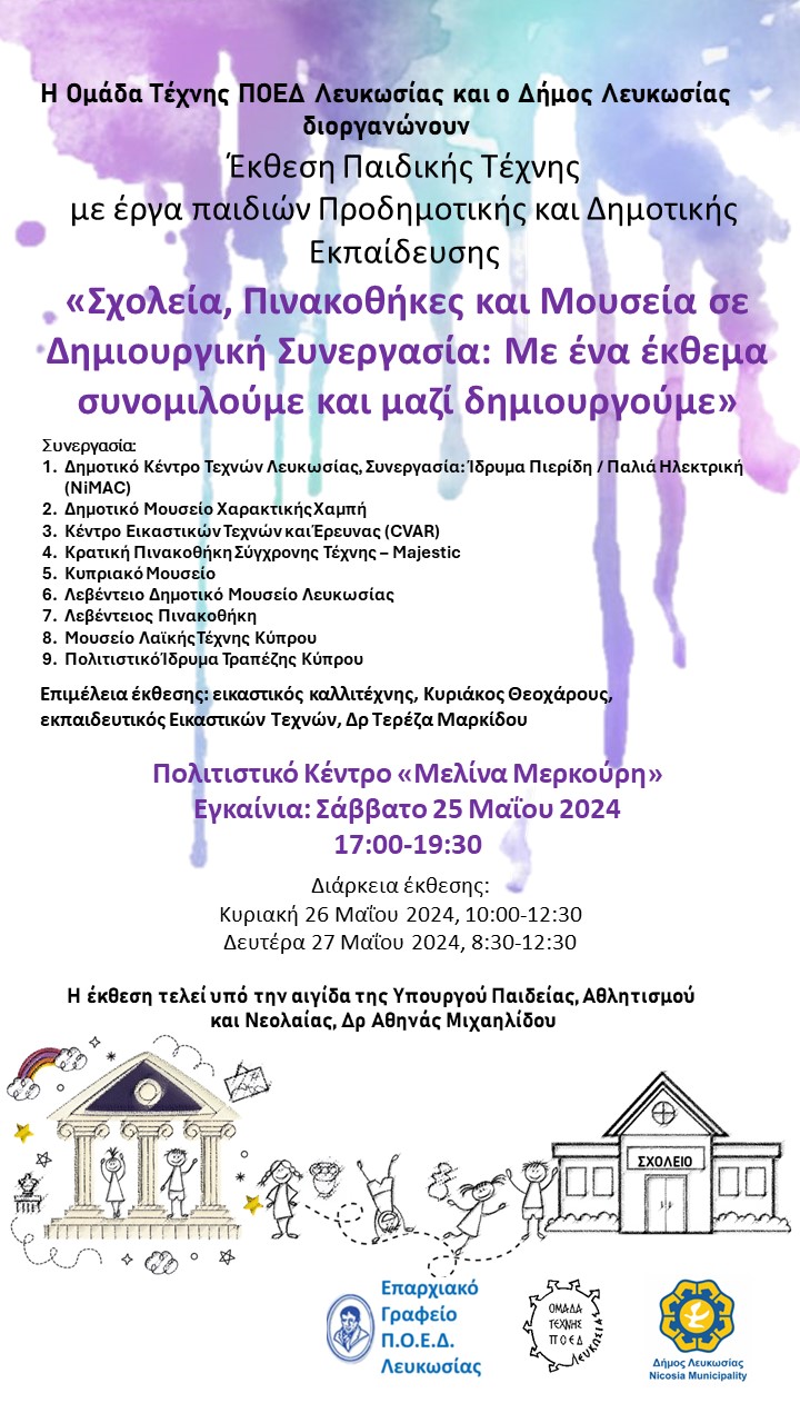 Η Ομάδα Τέχνης ΠΟΕΔ Λευκωσίας και ο Δήμος Λευκωσίας διοργανώνουν Έκθεση Παιδικής Τέχνης με έργα παιδιών Προδημοτικής και Δημοτικής Εκπαίδευσης «Σχολεία, Πινακοθήκες και Μουσεία σε Δημιουργική Συνεργασία: Με ένα έκθεμα συνομιλούμε και μαζί δημιουργούμε».