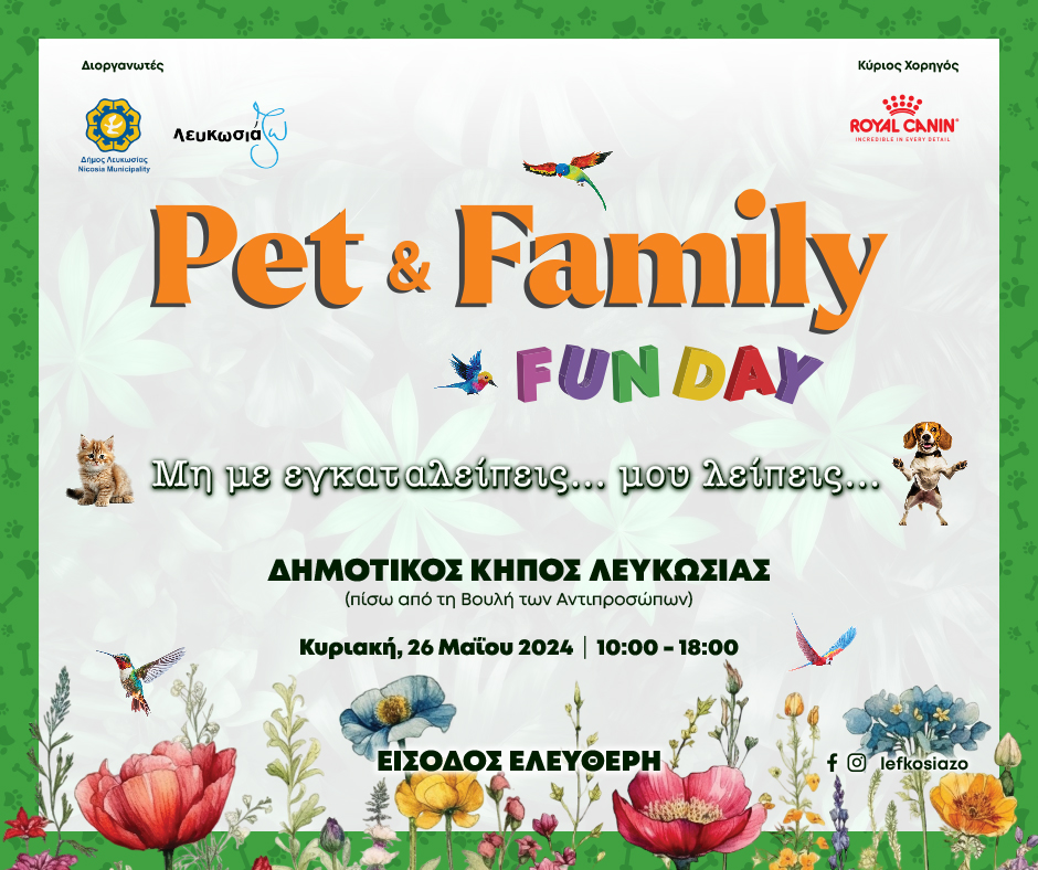 Το Pet and Family Fun Day, o θεσμός που δημιουργήθηκε πριν από 10 χρόνια από το Δίκτυο Εθελοντών ΛευκωσιάΖΩ και το Δήμο Λευκωσίας, επανέρχεται στο Δημοτικό Κήπο Λευκωσίας και το Δημοτικό Θέατρο Λευκωσίας την Κυριακή 26 Μαΐου 2024 από τις 10:30πμ μέχρι τις 6:00μμ.
