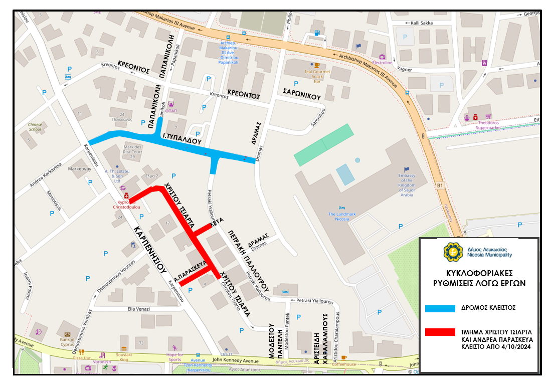 Ο Δήμος Λευκωσίας πληροφορεί το κοινό ότι από την Παρασκευή 4 Οκτωβρίου 2024 και η ώρα 7:00 π.μ., τμήμα των οδών Χρίστου Τσιάρτα και Ανδρέα Παρασκευά θα παραμείνει κλειστό για την τροχαία κίνηση για περίοδο 3 μηνών, λόγω εκτέλεσης εργασιών στο πλαίσιο του Έργου «Κατάλληλη κατασκευή διαφόρων οδών στη Λευκωσία – Συμβόλαιο 28 – Άγιοι Ομολογητές».