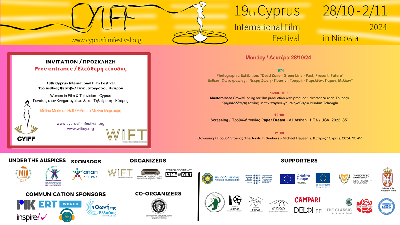 «ΔΙΕΘΝΕΣ ΦΕΣΤΙΒΑΛ ΚΙΝΗΜΑΤΟΓΡΑΦΟΥ ΚΥΠΡΟΥ», ένα ετήσιο πολιτιστικό θεσμό που φέτος είναι η δέκατη ένατη χρονιά διοργάνωσής του και θα πραγματοποιηθεί στην αίθουσα Μελίνα Μερκούρη στην Παλιά Λευκωσία από 28 Οκτωβρίου μέχρι 2 Nοεμβρίου 2024.