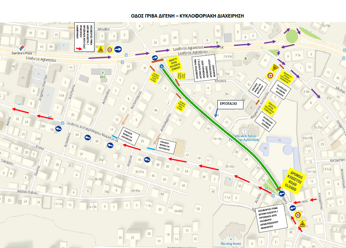 Συγκεκριμένα, η οδός Γρίβα Διγενή θα κλείσει από τη συμβολή της με τη Λεωφόρο Αγλαντζιάς μέχρι και τη συμβολή της με τη Λεωφόρο Μακαρίου Γ’. Ο δρόμος θα δοθεί στην κυκλοφορία, όταν θα ολοκληρωθεί η τοποθέτηση του νέου ασφαλτικού οδοστρώματος.
