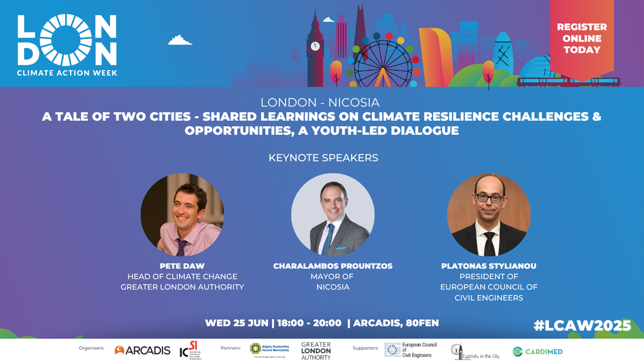 Ο Δήμος Λευκωσίας, στο πλαίσιο των στρατηγικών του πρωτοβουλιών για την κλιματική ανθεκτικότητα και τη βιώσιμη ανάπτυξη, συμμετέχει ενεργά στη London Climate Action Week 2025, συνδιοργανώνοντας την εκδήλωση “London – Nicosia: A Tale of Two Cities - Shared Learnings on Climate Resilience Challenges & Opportunities”, η οποία θα πραγματοποιηθεί την Τετάρτη 25 Ιουνίου 2025 στο Λονδίνο.