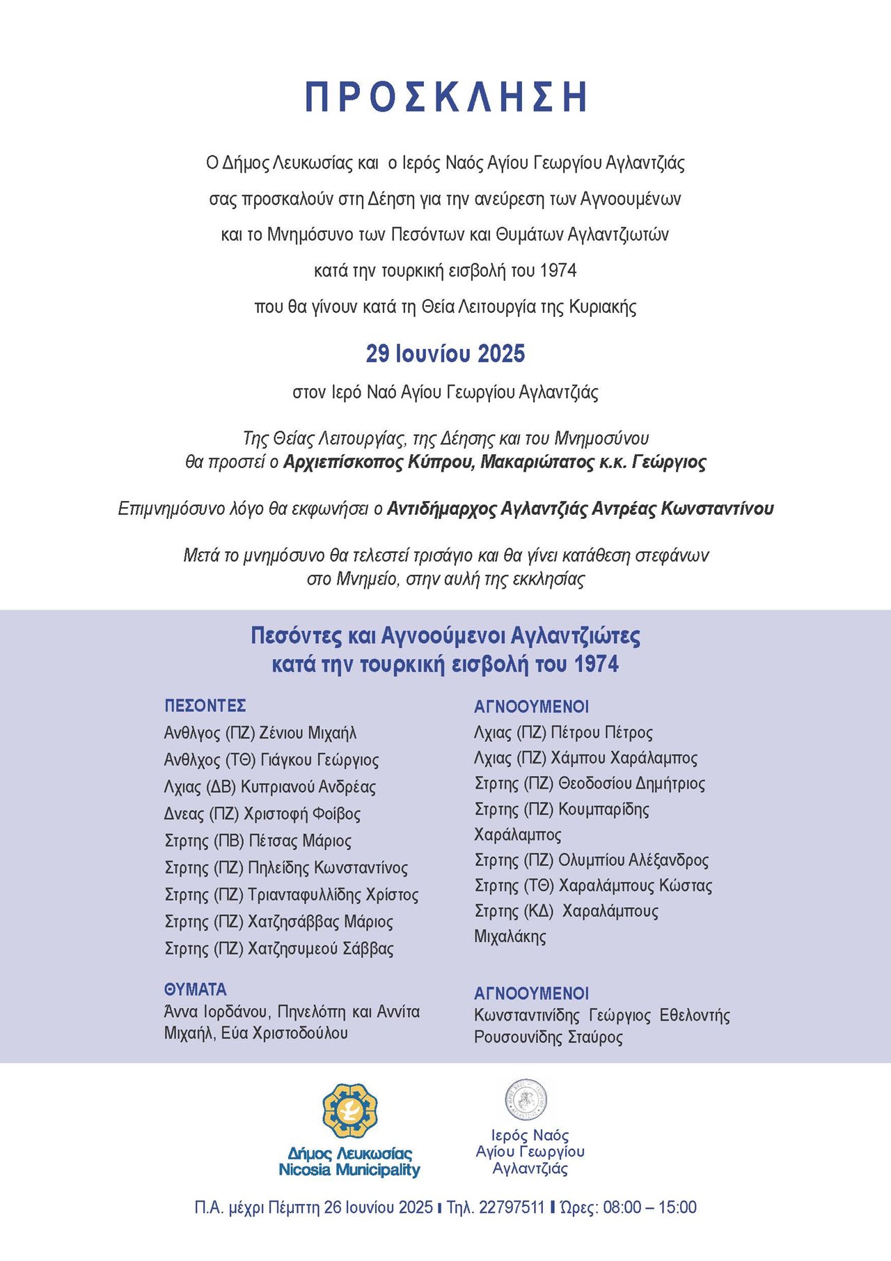 Ο Δήμος Λευκωσίας και ο Ιερός Ναός Αγίου Γεωργίου Αγλαντζιάς σας προσκαλούν στη Δέηση για την ανεύρεση των Αγνοουμένων και στο Μνημόσυνο των Πεσόντων και Θυμάτων Αγλαντζιωτών κατά την τουρκική εισβολή του 1974, που θα γίνουν κατά τη Θεία Λειτουργία της Κυριακής, 29 Ιουνίου 2025, στον Ιερό Ναό Αγίου Γεωργίου Αγλαντζιάς.