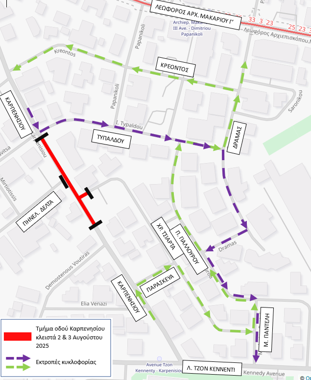 - Η κυκλοφορία από την οδό Καρπενησίου με βόρεια κατεύθυνση (προς τη Λεωφόρο Αρχ.Μακαρίου ΙΙΙ) θα είναι δυνατή μέσω των οδών Παρασκευά > Τσιάρτα > Παντελή > Γιάλλουρου > Τυπάλδου > Δράμας > Κρέοντος.