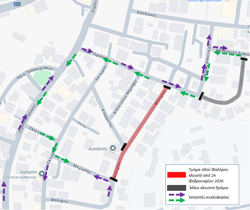 Οι εργασίες της Δ’ Φάσης θα ξεκινήσουν στις 24 Φεβρουαρίου 2026 και το επηρεαζόμενο τμήμα της οδού Φαλήρου θα παραμείνει κλειστό για την τροχαία κίνηση για χρονικό διάστημα τριών (3) μηνών.