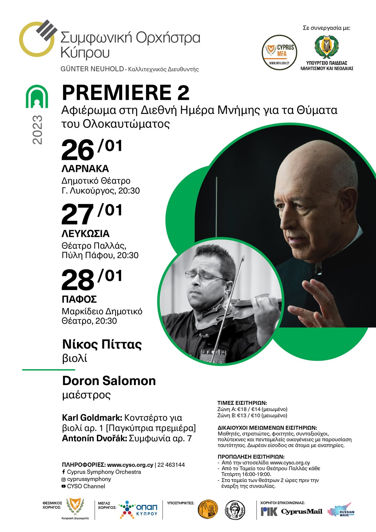 www.cyso.org.cy, το Ταμείο του Θεάτρου κάθε Τετάρτη 16:00-19:00 και 2 ώρες πριν την έναρξη.