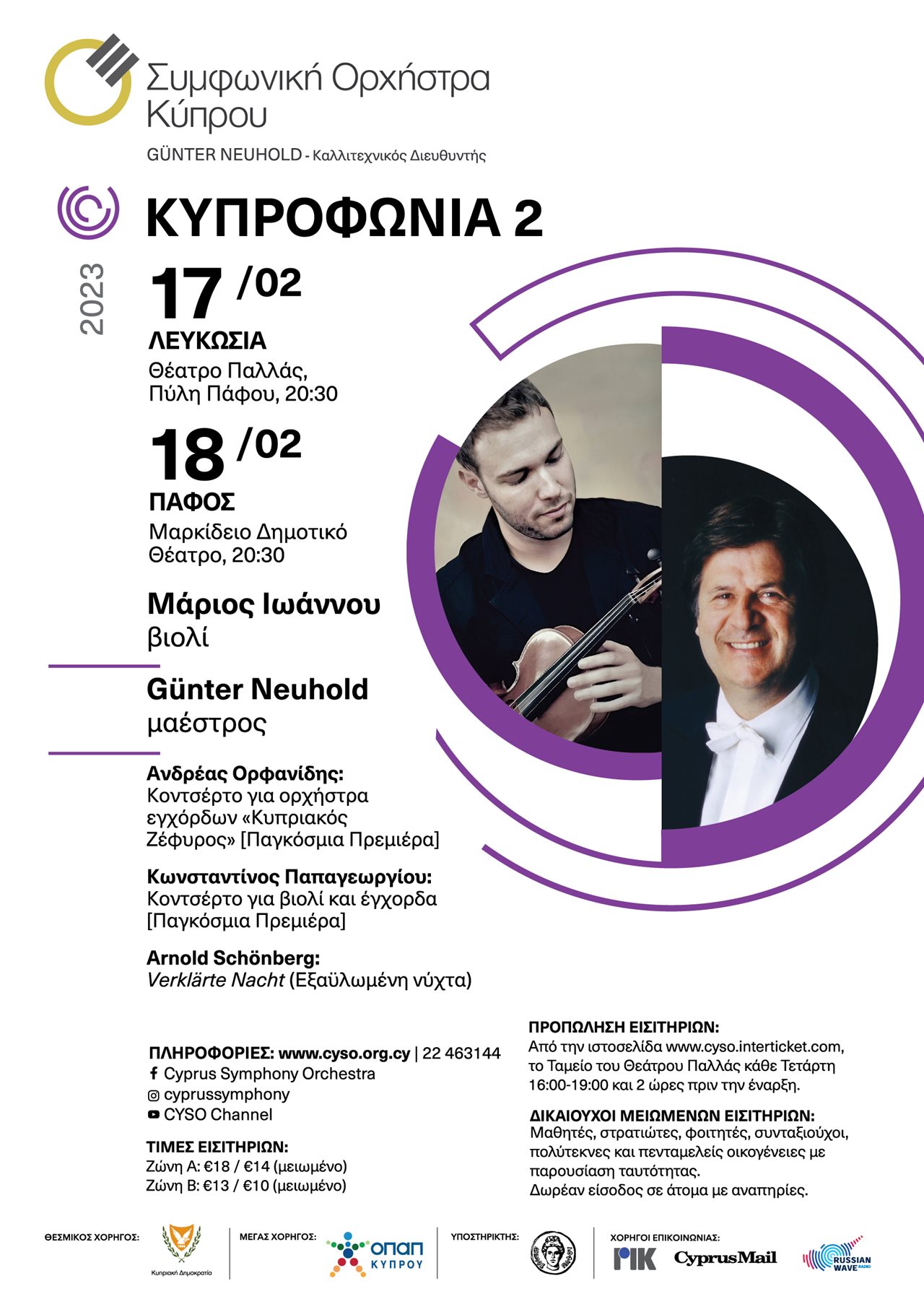H Συμφωνική Ορχήστρα Κύπρου, υπό την μπαγκέτα του Günter Neuhold παρουσιάζει την πρεμιέρα δύο έργων σύγχρονων Κυπρίων δημιουργών, καθώς και ένα από τα σημαντικότερα πρώιμα έργα του Arnold Schönberg.