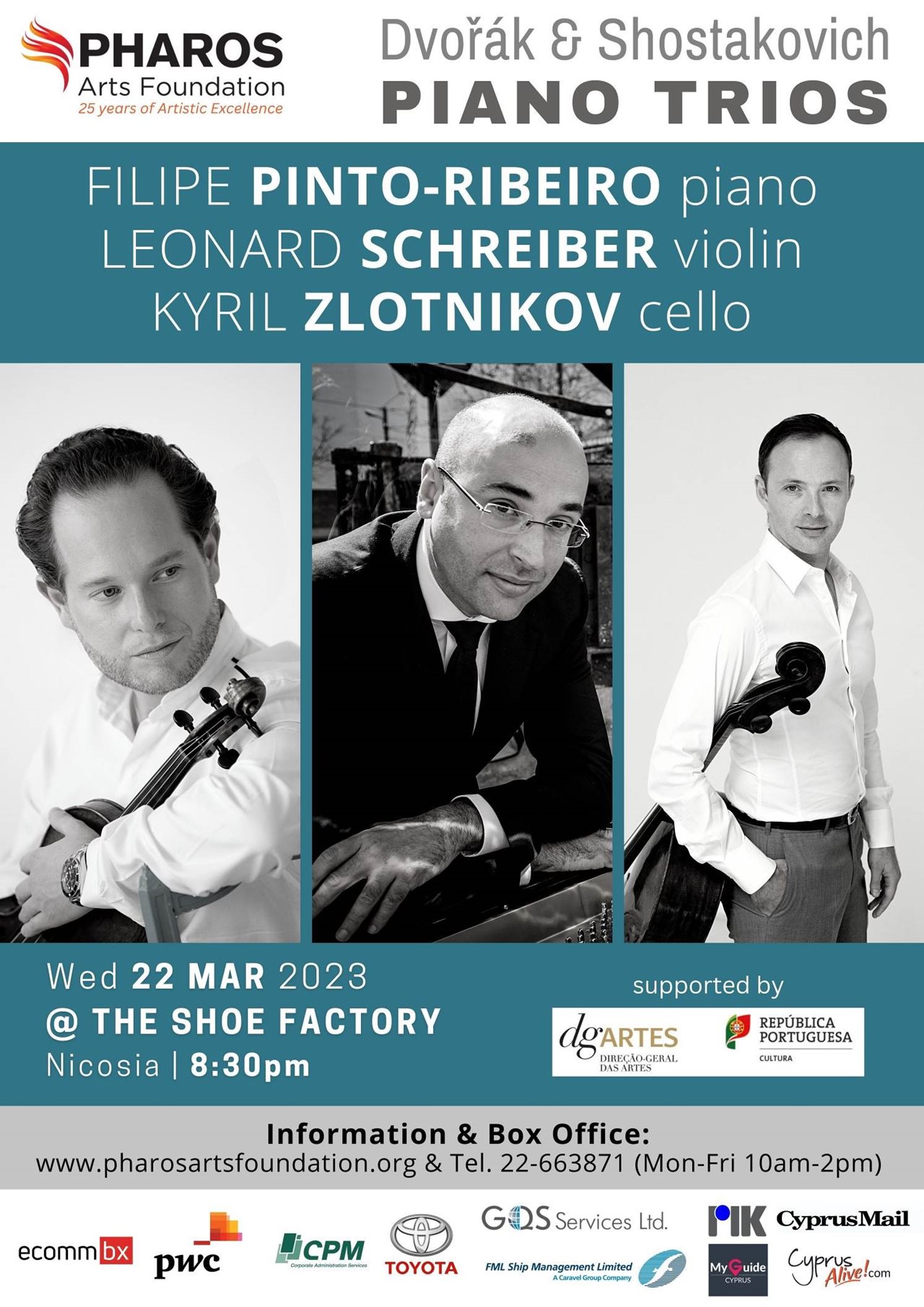 Το Ίδρυμα Τεχνών Φάρος φέρνει στην Κύπρο τρεις εξαίρετους, διεθνούς φήμης σολίστες για να ενώσουν τις δυνάμεις τους σε μια μοναδική συναυλία για τρίο για πιάνο. Ο Filipe Pinto-Ribeiro είναι ένας από τους κορυφαίους πιανίστες της Πορτογαλίας, με τεράστια εμπειρία σε όλο το φάσμα του ρεπερτορίου του πιάνου και ιδρυτής και καλλιτεχνικός διευθυντής του DSCH - Shostakovich Ensemble, το οποίο συγκαταλέγεται στα σημαντικότερα σύνολα του διεθνούς μουσικού στερεώματος. Ο βιολονίστας Leonard Schreiber έκανε το ντεμπούτο του σε ηλικία έξι ετών με τη Βασιλική Φιλαρμονική Ορχήστρα της Φλάνδρας στο Κουίν Ελίζαμπεθ Χολ της Αμβέρσας, και έκτοτε εμφανίζεται τακτικά με τις πιο φημισμένες ορχήστρες ανά το παγκόσμιο. Αναγνωρισμένος ως σολίστ και μουσικός δωματίου, o τσελίστας Kyril Zlotnikov είναι ιδρυτικό μέλος ενός εκ των πιο δυναμικών και συναρπαστικών κουαρτέτων εγχόρδων της εποχής μας – του Jerusalem Quartet, και έχει μοιραστεί την σκηνή με πολλούς από τους κορυφαίους καλλιτέχνες της εποχής μας. Για τη συναυλία τους στο The Shoe Factory στη Λευκωσία, την Τετάρτη 22 Μαρτίου / 8:30 μ.μ., οι τρεις μουσικοί θα ερμηνεύσουν δύο από τα σπουδαιότερα αριστουργήματα που γράφτηκαν ποτέ για το μέσο του τρίο για πιάνο: το μανιοκαταθλιπτικό «Ντούμκι» του Ντβόρζακ, το οποίο γράφτηκε αμέσως μετά το Ρέκβιεμ του συνθέτη, και το σπαραξικάρδιο Τρίο για Πιάνο Αρ.2 σε Μι ελάσσονα του Σοστακόβιτς, το οποίο συντέθηκε κατά την κορύφωση του Β' Παγκοσμίου Πολέμου.