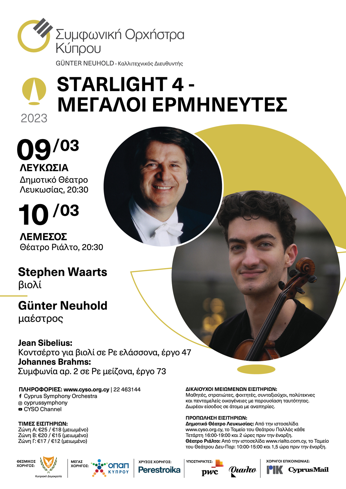 Ο διεθνούς φήμης βιολιστής Liviu Prunaru δυστυχώς δεν είναι σε θέση να συμπράξει μαζί μας στις συναυλίες. Είμαστε ευτυχείς να ανακοινώσουμε ότι τον αντικαθιστά ο πολυβραβευμένος βιολιστής Stephen Waarts - ένα ταχύτατα ανερχόμενο αστέρι στον κόσμο του βιολιού. H έμφυτη ποιητική μουσικότητα του Stephen Waarts τον έχει εδραιώσει ως ένα σταθερά αγαπητό στο κοινό καλλιτέχνη. Ο Waarts θα ερμηνεύσει το εξαιρετικά δεξιοτεχνικό Κοντσέρτο για βιολί του Jean Sibelius. Η συναυλία θα κλείσει με τη μελωδική, γεμάτη συναισθηματικές αντιθέσεις Δεύτερη Συμφωνία του Johannes Brahms.