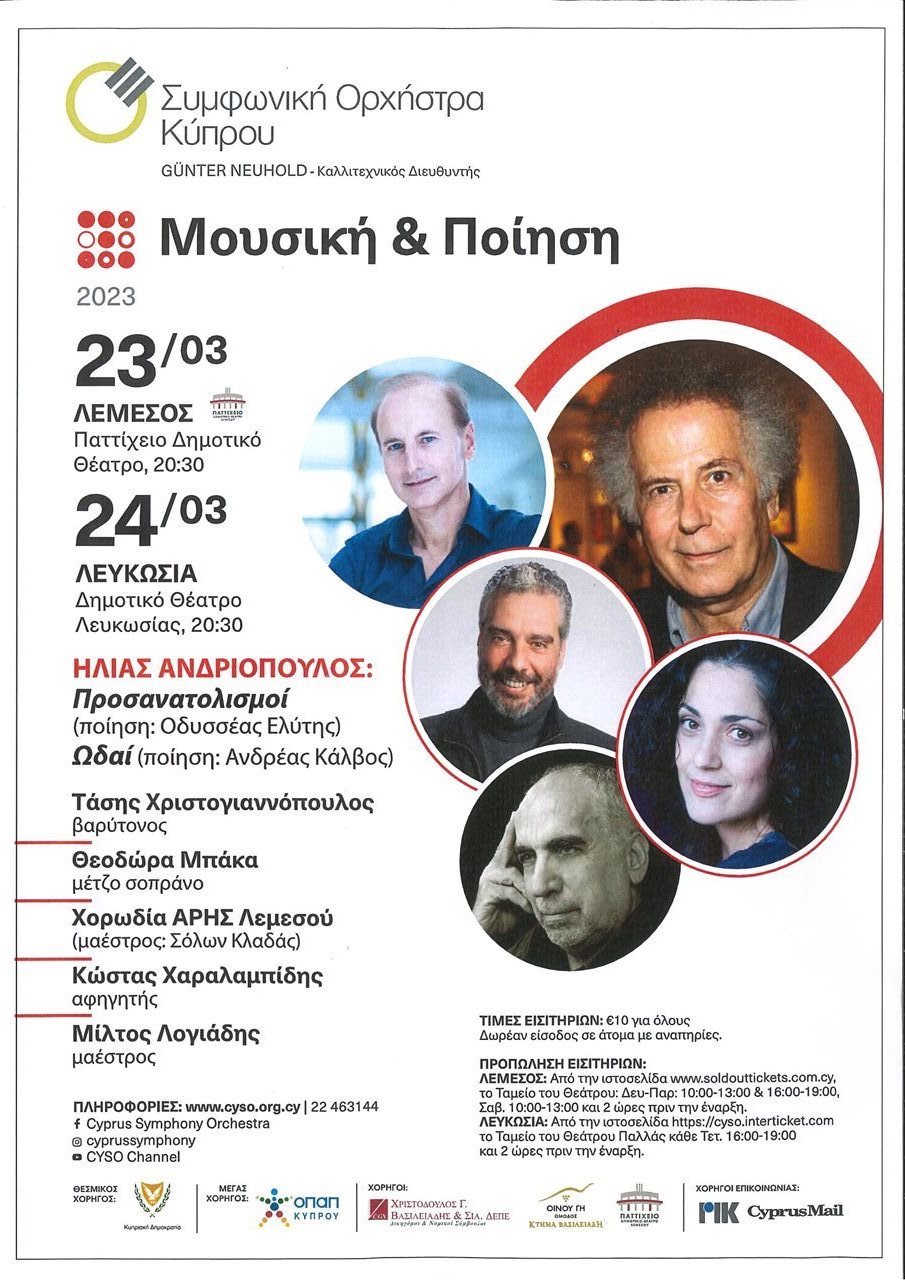 Σε αυτή την ξεχωριστή συναυλία, ο Μίλτος Λογιάδης διευθύνει τη Συμφωνική Ορχήστρα Κύπρου σε δύο εμβληματικά έργα μελοποιημένης ποίησης του καταξιωμένου Έλληνα συνθέτη Ηλία Ανδριόπουλου.