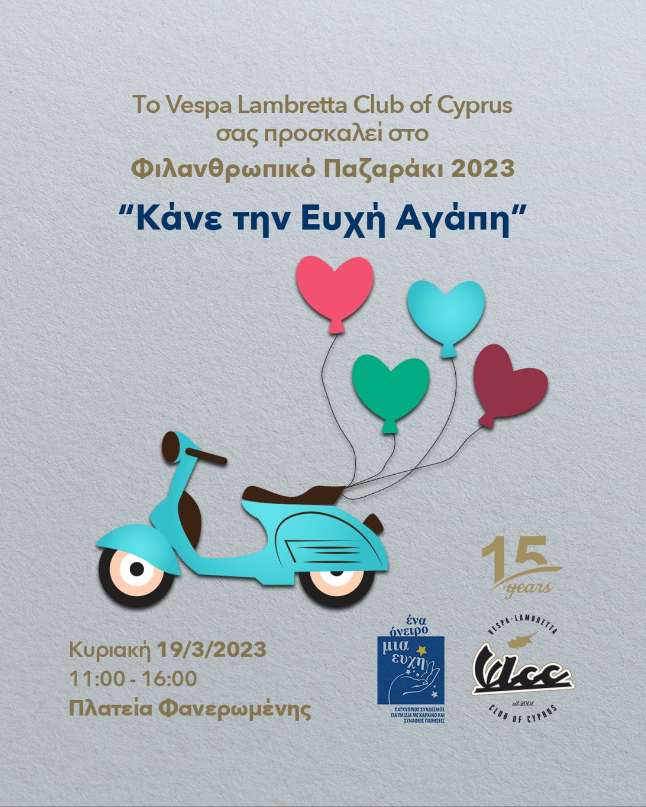 Στο πλαίσιο της "Διαδρομής Αγάπης 2023" το σωματείο μας "Vespa-Lambretta Club of Cyprus" συμμετέχει ενεργά την Κυριακή 19 Μαρτίου, όπου θα διεξάγει έρανο στη Λευκωσία από Cafe σε Cafe, τερματιζοντας στο προαύλιο της εκκλησίας Παναγίας Φανερωμένης. Εκεί όλοι μαζί στηρίζουμε το παζαρακι που διοργανώνουμε σε μια επιπλέον προσπάθεια ενίσχυσης του σκοπού αυτού.