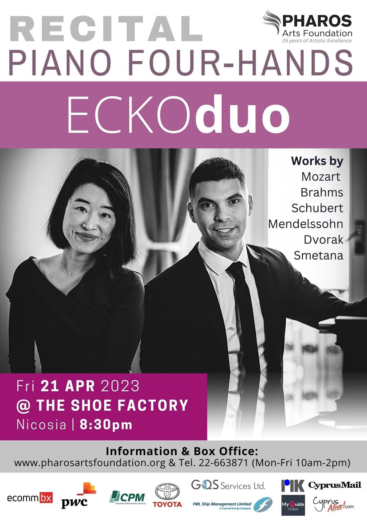Στοχεύοντας στην προώθηση σημαντικών Κυπρίων μουσικών, η Σειρά Κυπρίων Καλλιτεχνών του Ιδρύματος Τεχνών Φάρος παρουσιάζει ένα ρεσιτάλ για πιάνο τέσσερα-χέρια με το ECKOduo, το οποίο αποτελείται από τους πιανίστες Emre Öztek από την Κύπρο και Chisato Kusunoki από την Ιαπωνία. Ο Emre Öztek, απόφοιτος του Κονσερβατορίου Μουσικής του Πανεπιστημίου Λόρενς στο Ουισκόνσιν και του Κολλεγίου Μουσικής Τρίνιτι στο Λονδίνο, έχει κερδίσει πλειάδα βραβείων και διαγωνισμών, καθώς και διεθνή αναγνώριση ως σολίστ και μουσικός δωματίου. Το 2015, συνάντησε τη Γιαπωνέζα δεξιοτέχνη Chisato Kusunoki μέσα στο πλαίσιο της Διεθνούς Εαρινής Σχολής Πιάνου του Bromley στην Αγγλία, όπου διατελούσαν καθηγητές. Έχοντας επευφημηθεί για την λυρική της ένταση και την εκλεπτυσμένη της δεξιοτεχνία, καθώς και τα «θαυμάσια γοργά και εύπλαστα δάχτυλά της, που εντοπίζουν γρήγορα τις εσωτερικές φωνές της μουσικής», η Chisato είναι απόφοιτος του Πανεπιστημίου της Οξφόρδης, από όπου απέσπασε το περίφημο Βραβείο Gibbs στην Ερμηνεία, και της Βασιλικής Ακαδημίας Μουσικής του Λονδίνου. Τους δύο μουσικούς τους ένωσε η κοινή τους αγάπη για το υπέροχο ρεπερτόριο για πιάνο τέσσερα χέρια και δύο πιάνα, και το 2021, ίδρυσαν το ECKOduo, ένα από τα πιο δυναμικά και καινοτόμα πιανιστικά ντούο της μουσικής σκηνής των ημερών μας. Για το ρεσιτάλ τους την Παρασκευή 21 Απριλίου 2023, στο The Shoe Factory, Λευκωσία / 8:30μμ, το ECKOduo θα ερμηνεύσει ένα εντυπωσιακό πρόγραμμα για πιάνο τέσσερα-χέρια με έργα των Μότσαρτ, Μπραμς, Σούμπερτ, Μέντελσον, Ντβόρζακ και Σμέτανα.