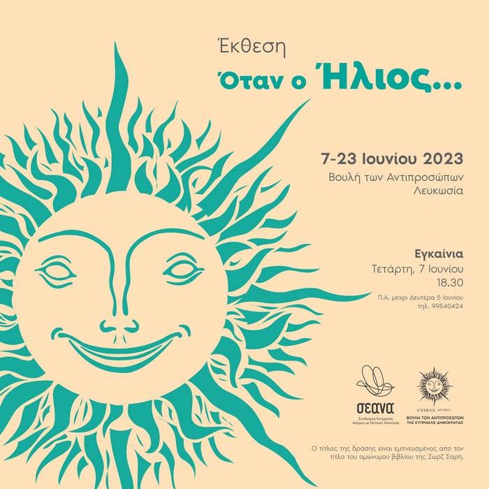 Ο Σύνδεσμος Ευημερίας Ατόμων με Νοητική Αναπηρία (ΣΕΑΝΑ) με τη στήριξη της Βουλής των Αντιπροσώπων ανακοινώνει τα εγκαίνια τις έκθεσης «Όταν ο ήλιος…» την Τετάρτη 7 Ιουνίου στις 18:30 στη Βουλή των Αντιπροσώπων.