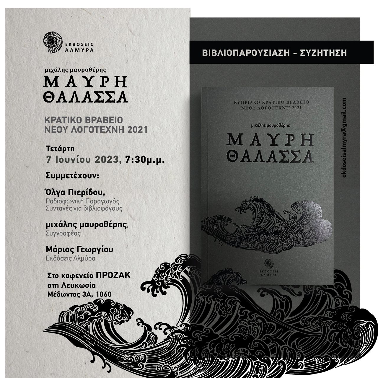 Μιχάλη Μαυροθέρη «Μαύρη Θάλασσα», (Κρατικό Βραβείο Νέου Λογοτέχνη, 2021) την Τετάρτη 7 Ιουνίου 2023 στις 7:30 μ.μ. στο