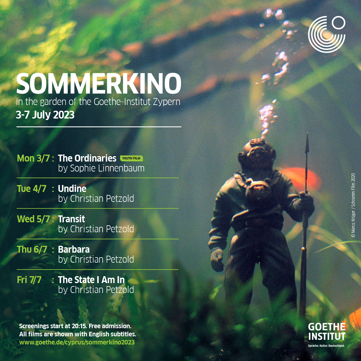 Sommerkino, τον θερινό του κινηματογράφο, με μια επιλογή γερμανικών ταινιών. Το φετινό πρόγραμμα περιλαμβάνει ταινίες του γνωστού σκηνοθέτη και σεναριογράφου Christian Petzold και της ανερχόμενης σκηνοθέτιδας και σεναριογράφου Sophie Linnenbaum. Για τις απόλυτες καλοκαιρινές βραδιές στην πόλη, κοπιάστε στον όμορφο κήπο του Ινστιτούτου Γκαίτε, όπου σας περιμένουν χαλαρή διάθεση με άνετες ξαπλώστρες, μεγάλη οθόνη με φόντο το διάσημο ξενοδοχείο του Λήδρα Πάλας, και κινηματογραφικά ταξίδια.