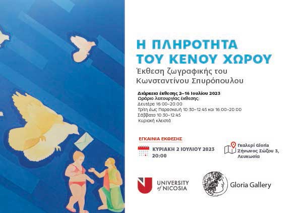 Το Πανεπιστήμιο Λευκωσίας και η Γκαλερί Γκλόρια συνδιοργανώνουν έκθεση του διεθνώς καταξιωμένου Έλληνα ζωγράφου Κωνσταντίνου Σπυρόπουλου. Τα εγκαίνια της σημαντικής αυτής έκθεσης με τίτλο «Η πληρότητα του κενού χώρου» θα γίνουν την Κυριακή 2/7/2023 και ώρα 8 μ.μ.