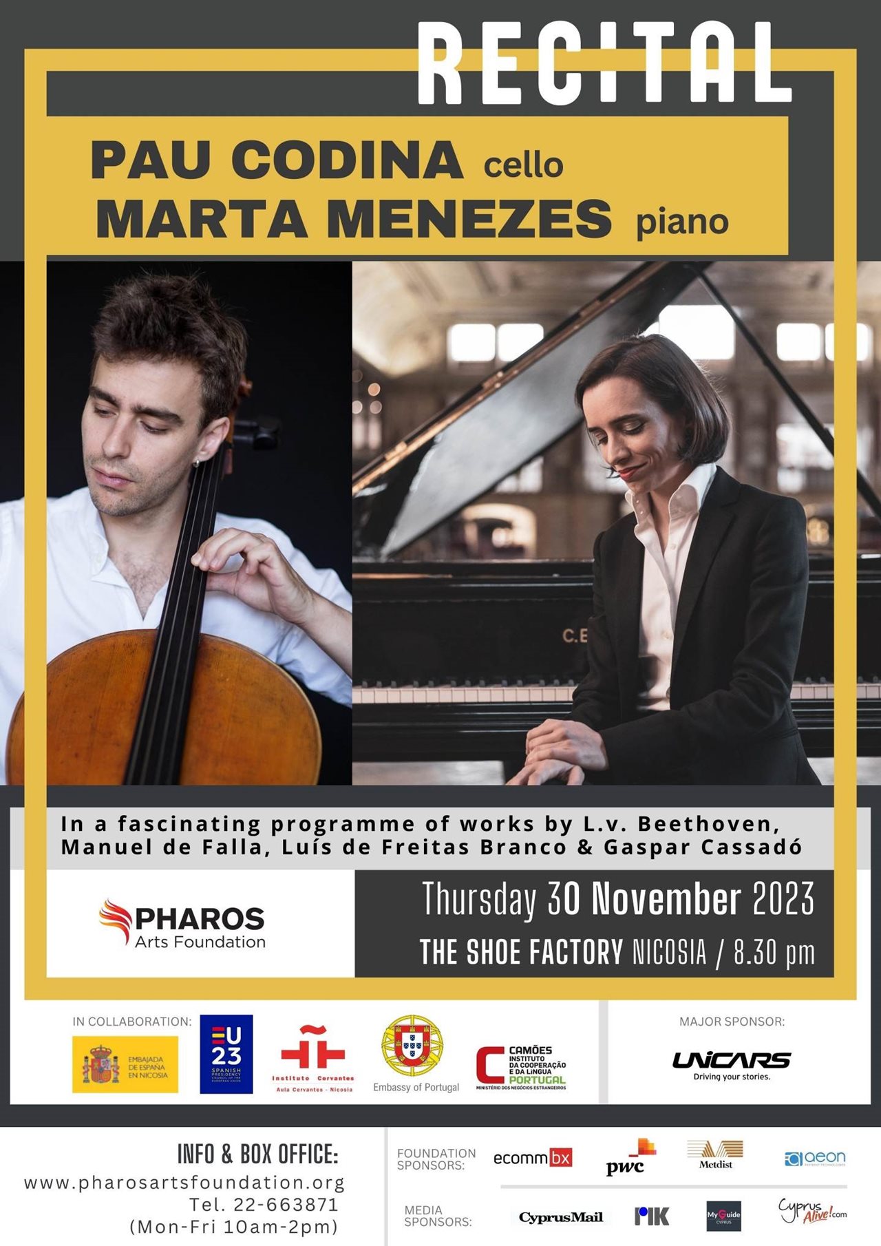 Έχοντας εμφανισθεί εκτενώς ως σολίστ και μουσικός δωματίου σε σημαντικές συναυλιακές αίθουσες ανά την Ευρώπη, μεταξύ άλλων, Γουίγκμορ Χολ του Λονδίνου, Κοντσερτγκεμπάου του Άμστερνταμ, Φλαζέ και Μποζάρ των Βρυξελλών, Αμφιθέατρο της Βαρκελώνης και Μέγαρο Καταλανικής Μουσικής, ο Pau έχει εμφανισθεί ως σολίστ με διακεκριμένες ορχήστρες όπως Βασιλική Φιλαρμονική Ορχήστρα της Λιέγης, Συμφωνική Ορχήστρα της Βαρκελώνης, Ορχήστρα Δωματίου της Βαλονίας, Συμφωνική Ορχήστρα Ισπανικής Ραδιοφωνίας και Τηλεόρασης στη Μαδρίτη. Η Marta Menezes είναι μια από τις πιο εξέχουσες Πορτογαλίδες πιανίστριες της γενιάς της, φημισμένη για τη λεπτότητα και τη μουσική ευαισθησία των ερμηνειών της. Έχει εμφανισθεί σε σπουδαίες αίθουσες μουσικής και φεστιβάλ ανά το παγκόσμιο όπως, Εθνικό Κέντρο Παραστατικών Τεχνών στο Πεκίνο, St. Martin-in-the-Fields στο Λονδίνο, Φεστιβάλ Φρεντερίκ Σοπέν στη Βαρσοβία, και Πολιτιστικό Κέντρο Μπελέμ στη Λισαβώνα, ενώ έχει συμπράξει με ορισμένες από τις πιο σημαίνουσες ορχήστρες στην Ευρώπη, μεταξύ άλλων, Μητροπολιτική Ορχήστρα της Λισαβώνας και Εθνική Ορχήστρα Ισπανίας. Για το ντεμπούτο τους στην Κύπρο, την Πέμπτη 30 Νοεμβρίου 2023 στο The Shoe Factory, Λευκωσία / 8:30μμ, οι Codina και Menezes θα ερμηνεύσουν ένα συναρπαστικό πρόγραμμα πλούσιο στην πολυτυπία και πρωτοτυπία της πορτογαλικής και ισπανικής μουσικής κληρονομιάς, με έργα των Λούντβιχ βαν Μπετόβεν, Μανουέλ ντε Φάλια, Λουίς ντε Φρέιτας Μπράνκο και Γκασπάρ Κασαντό. Το ρεσιτάλ συνδιοργανώνεται με τις Πρεσβείες της Πορτογαλίας και της Ισπανίας, επί τη ευκαιρία της ολοκλήρωσης της ισπανικής Προεδρίας του Συμβουλίου της ΕΕ. Μέγας χορηγός της συναυλίας η Unicars.
