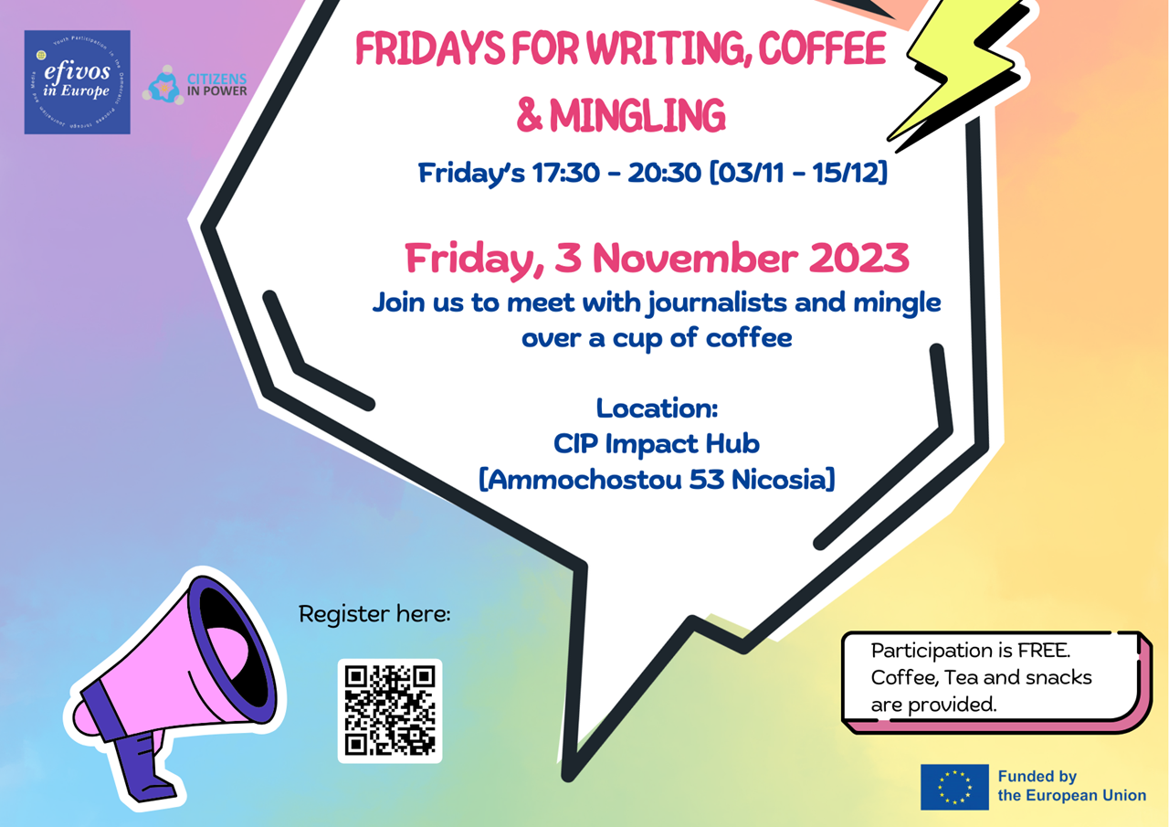 Ελάτε μαζί μας τις Παρασκευές για να απολύσετε απογεύματα γεμάτα καφέ, συγγραφή και παρέα. Κάθε Παρασκευή θα έχουμε και ένα πάνελ με δημοσιογράφους, για να μάθουμε περισσότερα για την δημοσιογραφία στην Κύπρο και να εμπνευστούμε για να γράψουμε τα δικά μας άρθρα.