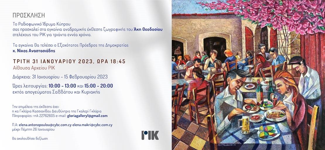 Το Ραδιοφωνικό Ίδρυμα Κύπρου σας προσκαλεί στα εγκαίνια αναδρομικής έκθεσης ζωγραφικής του Άκη Θεοδοσίου, στελέχους του ΡΙΚ για τριάντα εννέα χρόνια.