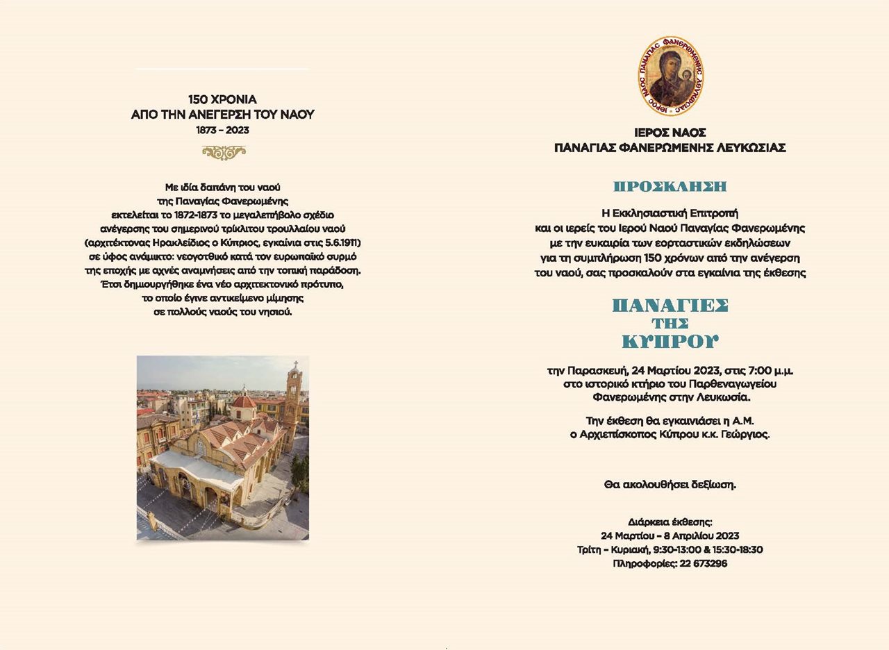 Συμπληρώνονται φέτος 150 χρόνια από την ανέγερση του Ιερού Ναού Παναγίας Φανερωμένης Λευκωσίας στη σημερινή του μορφή. Η Εκκλησιαστική Επιτροπή και οι ιερείς του Ναού πραγματοποιούν σειρά εθνικοθρησκευτικών εορταστικών εκδηλώσεων.