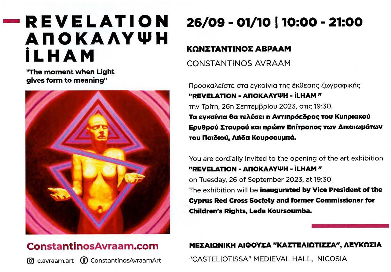 Προσκαλείστε στα εγκαίνια της έκθεσης ζωγραφικής “Revelation - Αποκάλυψη - Ilham” την Τρίτη 26 Σεπτεμβρίου 2023, στις 19:30.
