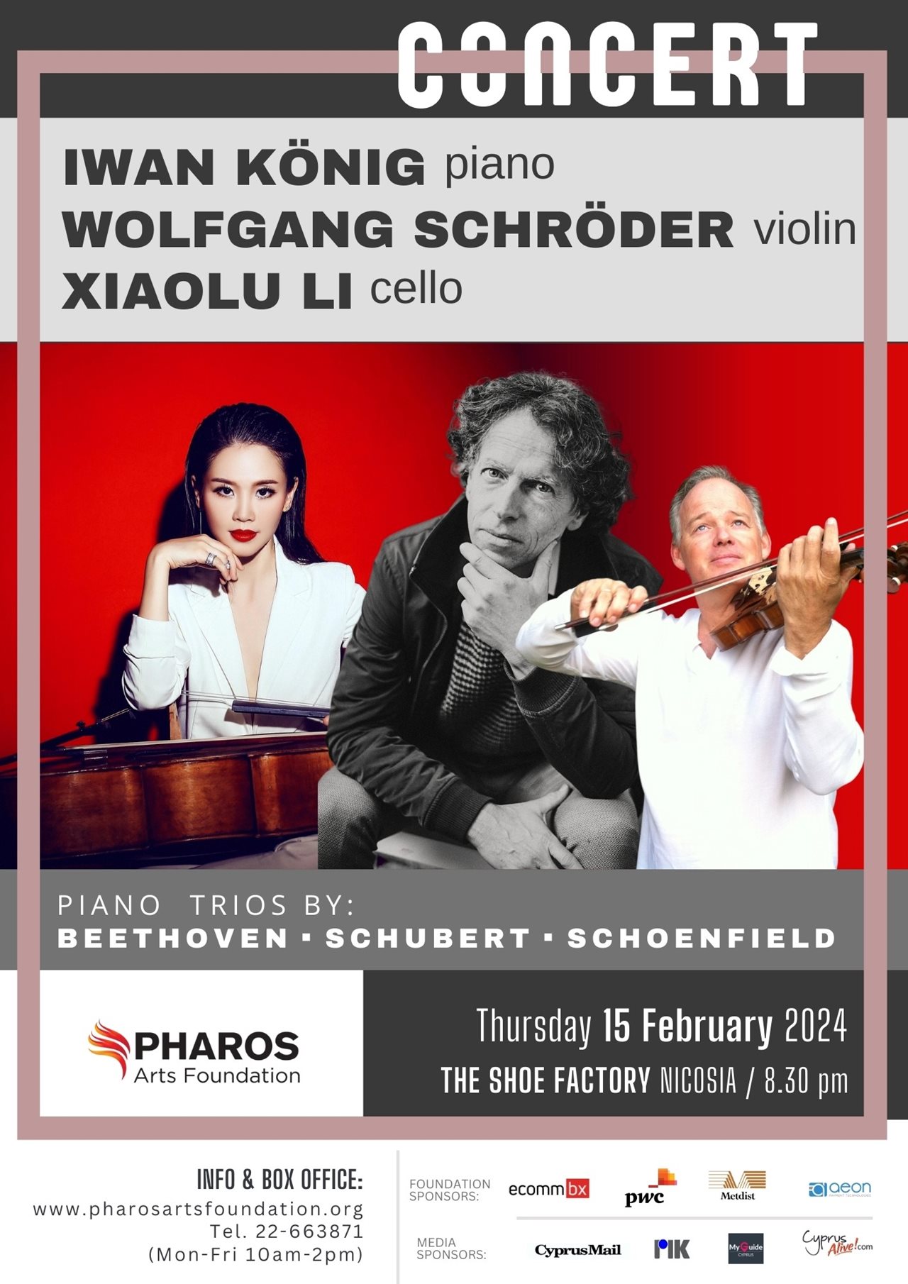 Μια μοναδική συναυλία επιφυλάσσει το Ίδρυμα Τεχνών Φάρος για τον Φεβρουάριο, παρουσιάζοντας τη σύμπραξη τριών πολύ ξεχωριστών μουσικών: Τον γνωστό στο κυπριακό κοινό βιολονίστα Wolfgang Schröder, τον διεθνούς φήμης Γερμανό πιανίστα Iwan König και τη χαρισματική νεαρή Κινέζα τσελίστρια Xiaolu Li. Ο Iwan König είναι ο διευθυντής του περίφημου διεθνούς φεστιβάλ Musikalischer Sommer (Μουσικό Καλοκαίρι) στο Όστφρισλαντ, και νικητής του Διεθνούς Διαγωνισμού Πιάνου στο Μπρε, του Πρώτου Διεθνούς Διαγωνισμού Πιάνου Σοπέν στο Ντάρμσταντ και του Διαγωνισμού Πιάνου Αρτούρ Σνάμπελ στο Βερολίνο. Έχοντας αναγνωρισθεί για την πλούσια μουσική της ευαισθησία και αντίληψη, η Xiaolu Li θεωρήθηκε από πολύ νεαρή ηλικία ως ένα σπάνιο παιδί θαύμα και έχει εμφανισθεί εκτενώς ανά το παγκόσμιο. Ο Wolfgang Schröder έχει εμφανισθεί ως σολίστ και μουσικός δωματίου σε αίθουσες όπως, Φιλαρμονική Βερολίνου, Κοντσερτγκεμπάου Άμστερνταμ, Κοντσέρτχαους Βιέννης, Λίνκολν Σέντερ Νέας Υόρκης, Γουίγκμορ Χολ του Λονδίνου, μεταξύ άλλων. Οι τρεις μουσικοί θα ενώσουν τις δυνάμεις τους για να ερμηνεύσουν ένα απολαυστικό πρόγραμμα για τρίο για πιάνο, που θα περιλαμβάνει έργα των Μπετόβεν, Σούμπερτ και Πολ Σένφιλντ. Η συναυλία θα πραγματοποιηθεί την Πέμπτη 15 Φεβρουαρίου 2024, στο The Shoe Factory, Λευκωσία / 8:30μμ.