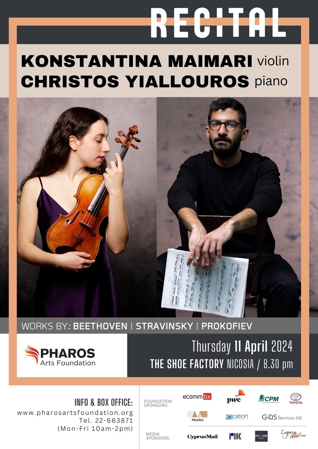 Μέσα στο πλαίσιο της Σειράς Κυπρίων Καλλιτεχνών, που έχει ως στόχο την προώθηση σημαντικών μουσικών από την Κύπρο, το Ίδρυμα Τεχνών Φάρος παρουσιάζει ένα ρεσιτάλ για βιολί & πιάνο με δύο εξαίρετους Κύπριους καλλιτέχνες της νέας γενιάς. Με τις ερμηνείες της να έχουν περιγραφεί ως «θερμές, ζωηρές, με αποχρώσεις γεμάτες ενέργεια», η βιολονίστρια Κωνσταντίνα Μαϊμάρη έχει εμφανισθεί σε σημαντικά φεστιβάλ, αίθουσες, και σειρές συναυλιών ανά την Ευρώπη, μεταξύ άλλων, Βασιλικό Μέγαρο του Εδιμβούργου, Φεστιβάλ Αιξ-αν-Προβάνς (Γαλλία), και Φεστιβάλ Μουσικής Δωματίου Ρόζιν (Ηνωμένο Βασίλειο), ενώ έχει συνεργαστεί με ορχήστρες και σύνολα όπως Εθνική Βασιλική Ορχήστρα της Σκωτίας, Εθνική Όπερα Σκωτίας, και Κουαρτέτο Εγχόρδων Brodsky. Η Κωνσταντίνα θα ενώσει τις δυνάμεις της με τον αξιοσημείωτο νεαρό πιανίστα Χρίστο Γιάλλούρο – διδακτορικό φοιτητή στο Πανεπιστήμιο της Οξφόρδης. Με ένα εντυπωσιακό εύρος ρεπερτορίου που εκτείνεται από την Μπαρόκ έως τη σύγχρονη μουσική, ο Χρίστος έχει δώσει τις παγκόσμιες πρεμιέρες αρκετών νέων έργων για σόλο πιάνο και μικρά σύνολα, και έχει συνεργαστεί με καλλιτέχνες κινουμένων σχεδίων πάνω σε πρότζεκτ που παρουσιάστηκαν στο πλαίσιο του London Piano Festival. Για το ρεσιτάλ τους την Πέμπτη 11 Απριλίου 2024, στο The Shoe Factory, Λευκωσία / 8:30μμ, η Κωνσταντίνα Μαϊμάρη και ο Χρίστος Γιάλλουρος θα επιδείξουν τα εκπληκτικά τους ταλέντα σε ένα δεξιοτεχνικό πρόγραμμα από σονάτες των Μπετόβεν, Στραβίνσκι, και Προκόφιεφ.