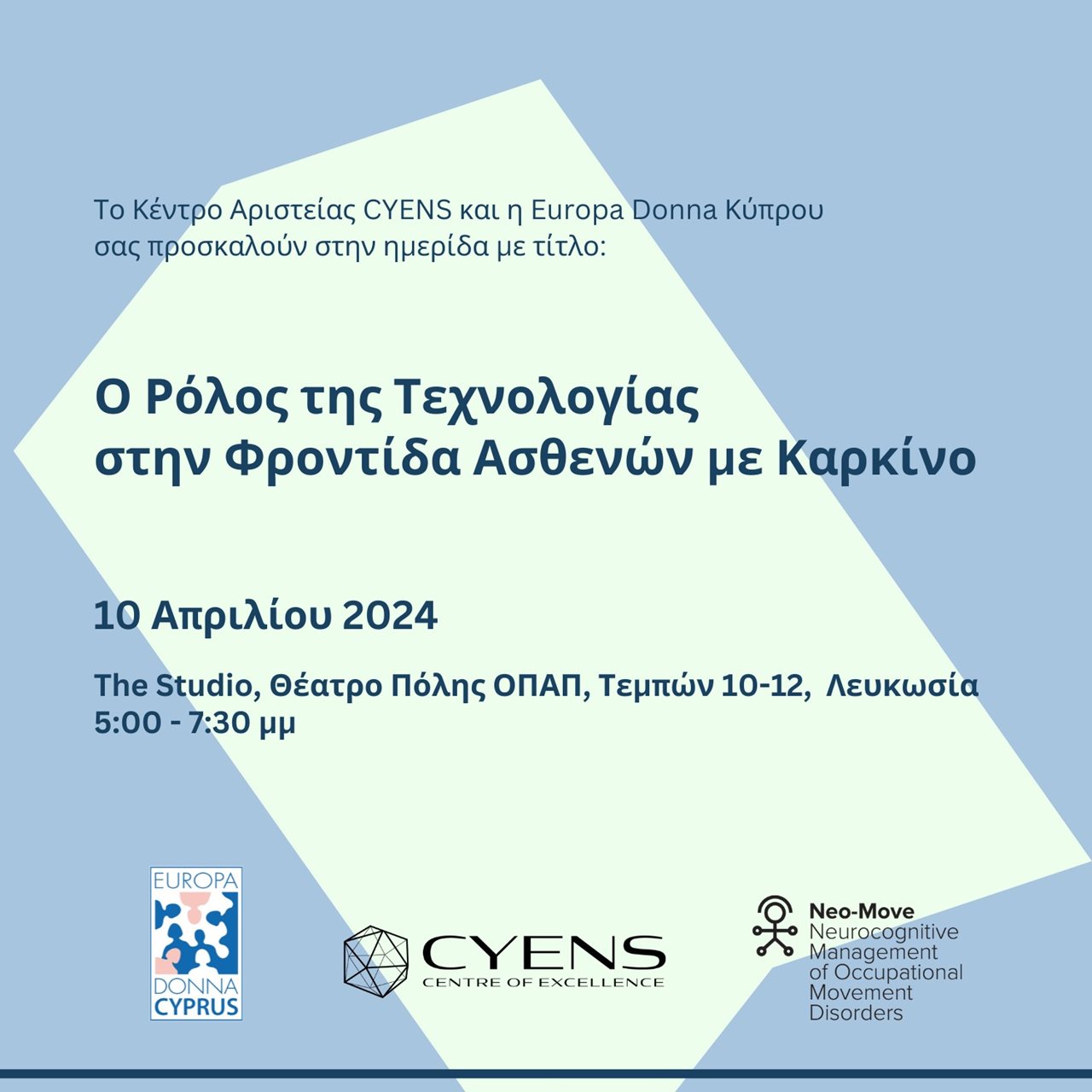 Το Κέντρο Αριστείας CYENS και η Europa Donna Κύπρου συνδιοργανώνουν την ημερίδα με τίτλο: Ο Ρόλος της Τεχνολογίας στην Φροντίδα Ασθενών με Καρκίνο.