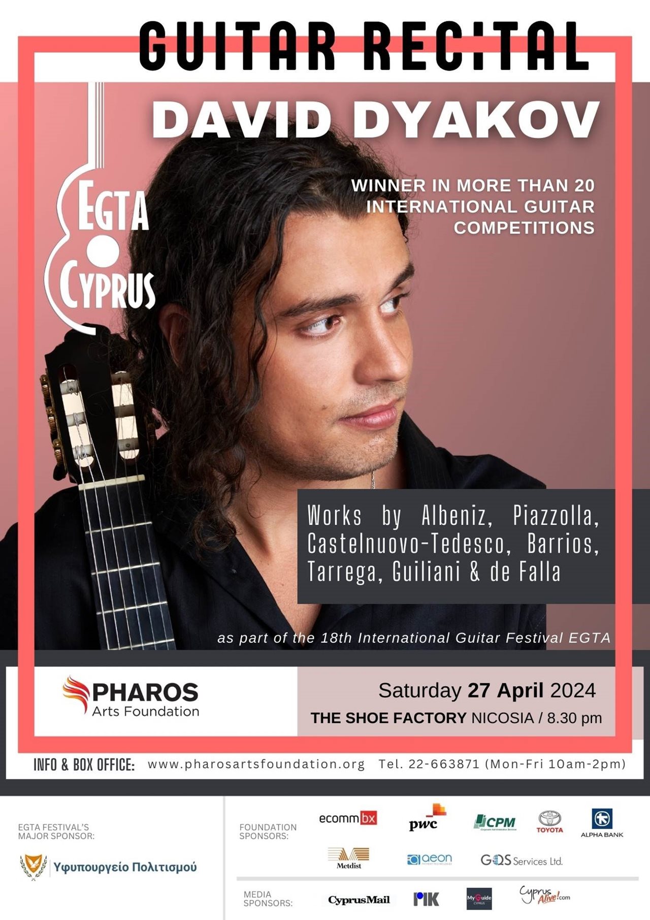 Όπως κάθε χρόνο, την ίδια εποχή, οι κιθαρόφιλοι θεατές θα έχουν την ευκαιρία να απολαύσουν μια μοναδική εμπειρία με τον David Dyakov - έναν από τους πιο εξέχοντες κιθαρίστες της γενιάς του - ο οποίος θα παρουσιάσει ένα ρεσιτάλ για κλασική κιθάρα, μέσα στο πλαίσιο του 18ου Διεθνούς Φεστιβάλ Κιθάρας EGTA - Κύπρου, που διοργανώνεται σε συνεργασία με το Ίδρυμα Τεχνών Φάρος. Ο Dyakov είναι νικητής σε περισσότερους από 20 διεθνείς διαγωνισμούς κιθάρας, μεταξύ άλλων, Forum Βιέννης, Διεθνή Διαγωνισμό Κιθάρας του Κόμπλεντς, και Γκραν Πρι Κιθάρας του Άαχεν στη Γερμανία, Διαγωνισμό της Νταϊτζόνγκ στη Νότιο Κορέα, Διεθνή Διαγωνισμό Κιθάρας της Βέροιας, και έχει εμφανισθεί ως σολίστ με πέραν των 40 ορχηστρών συμπεριλαμβανομένων Ορχήστρας Orpheus, Φιλαρμονικής της Σόφιας, και Φιλαρμονικής Αθηνών. Για το ρεσιτάλ του στο The Shoe Factory στη Λευκωσία, το Σάββατο 27 Απριλίου 2024 / 8:30μμ, ο David Dyakov θα εντυπωσιάσει με τη δεξιοτεχνία του σε ένα συναρπαστικό πρόγραμμα με έργα των Αλμπένιθ, Πιατσόλα, Μπάριος, Ταρέγκα, Καστελνουόβο - Τεντέσκο, ντε Φάλια και Τζιουλιάνι.