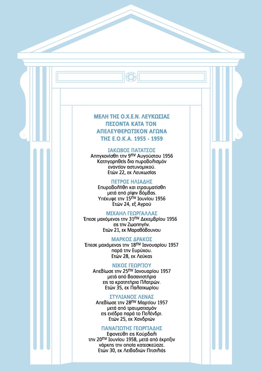 Μετά το μνημόσυνο θα τελεσθεί τρισάγιο και θα γίνει κατάθεση στεφάνων στην Μαρμάρινη Στήλη των πεσόντων ηρώων, που ευρίσκεται στο ισόγειο του κτιρίου της ΟΧΕΝ Λευκωσίας στον περίβολο του Ναού.