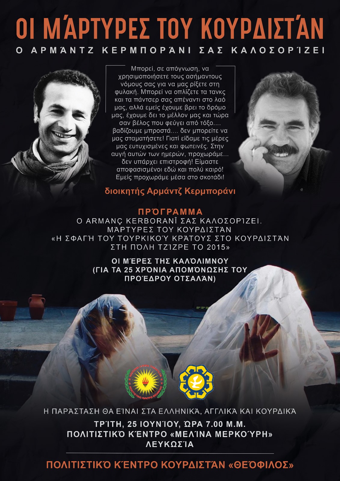 Το Πολιτιστικό Κέντρο Κουρδιστάν «Θεόφιλος» οργανώνει μια θεατρική παράσταση, την Τρίτη, 25 Ιουνίου, στις 8.00 μ.μ., στο Πολιτιστικό Κέντρο «Μελίνα Μερκούρη», στη Λευκωσία.