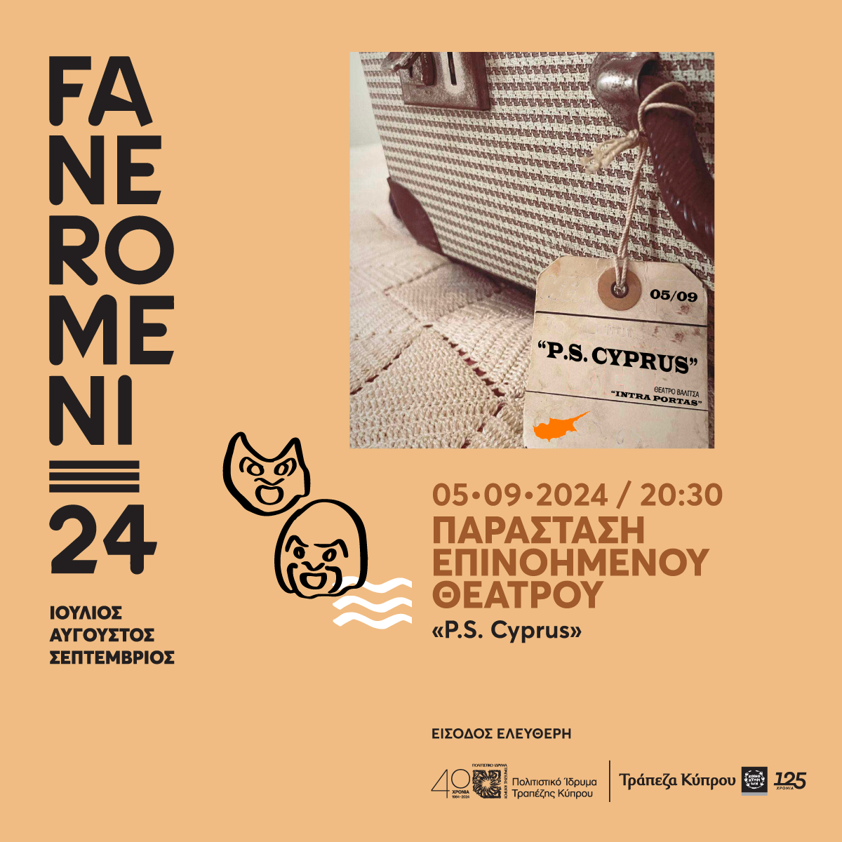 Θεάτρου Βαλίτσα Intra Portas με βάση ντοκουμέντα και τεκμήρια ξένων ταξιδευτών, δημιουργεί την παράσταση επινοημένου θεάτρου “P.S.CYPRUS” για να αναδείξει το αφήγημα της Κύπρου του τότε. Τέσσερις ηθοποιοί στη λογική ενός λαϊκού μπουλουκιού στήνουν ένα γλέντι ξυπνώντας μνήμες του παρελθόντος.