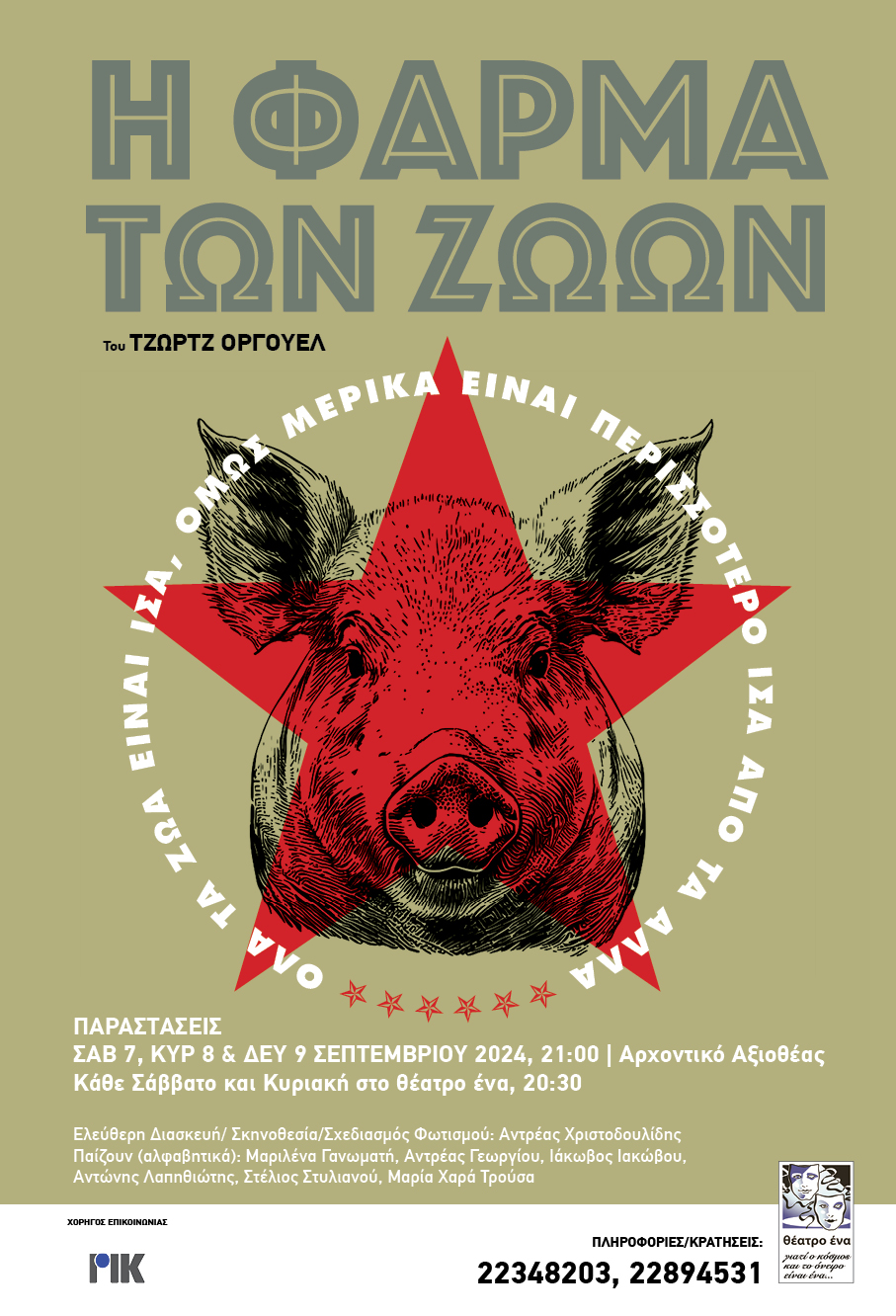 Το θέατρο ένα παρουσιάζει το αριστούργημα του Τζωρτζ Οργουέλ «Η Φάρμα των ζώων» σε ελεύθερη διασκευή και σκηνοθεσία Αντρέα Χριστοδουλίδη.