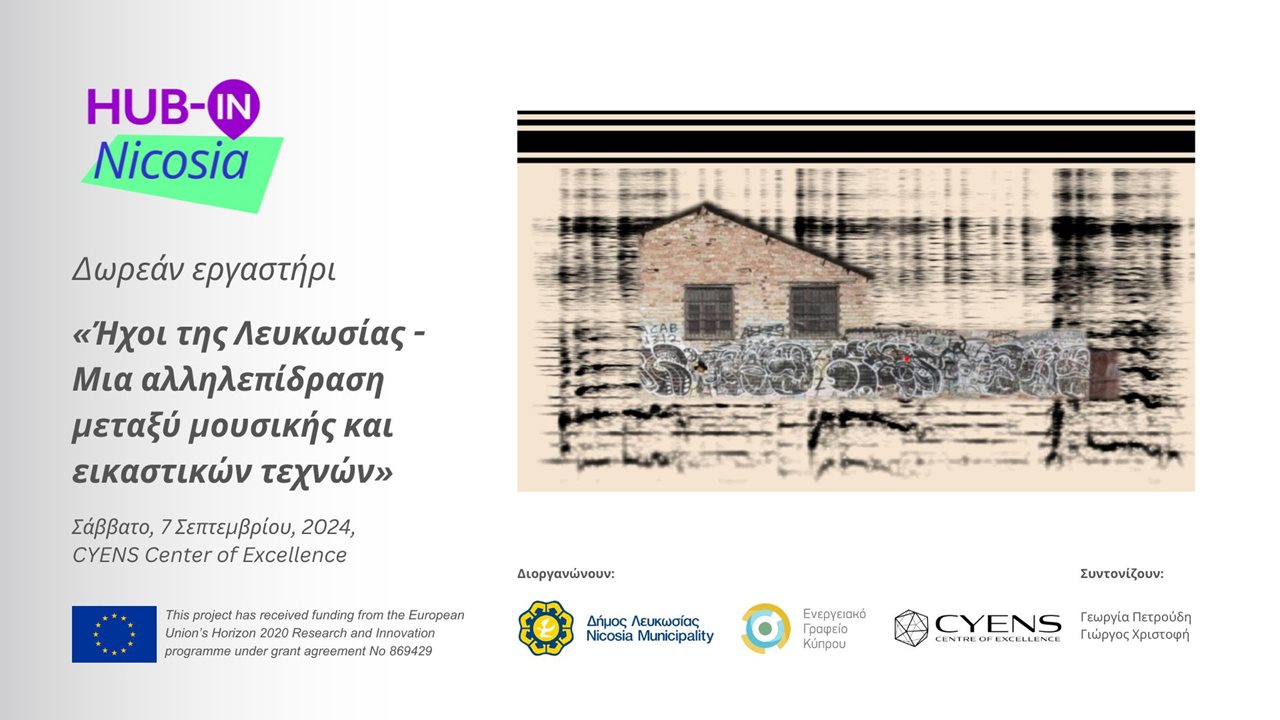 Το εργαστήριο μουσικής με τίτλο «Ήχοι της Λευκωσίας – Μια αλληλεπίδραση μεταξύ μουσικής και εικαστικών τεχνών» θα πραγματοποιηθεί από τους μουσικούς Γεωργία Πετρούδη, Γιώργο Χριστοφή και Εύα Σταύρου στο Κέντρο Αριστείας CYENS.