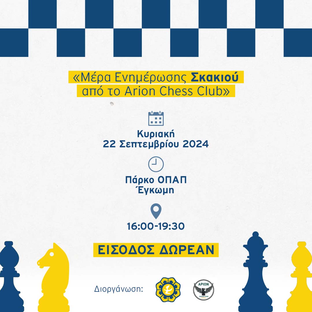 Ο Σκακιστικός Όμιλος Αρίων σε συνεργασία με τον Δήμο Λευκωσίας διοργανώνει μια ξεχωριστή εκδήλωση στις 22 Σεπτεμβρίου 2024, στο Πάρκο ΟΠΑΠ Έγκωμης, από τις 16:00 έως τις 19:30.
