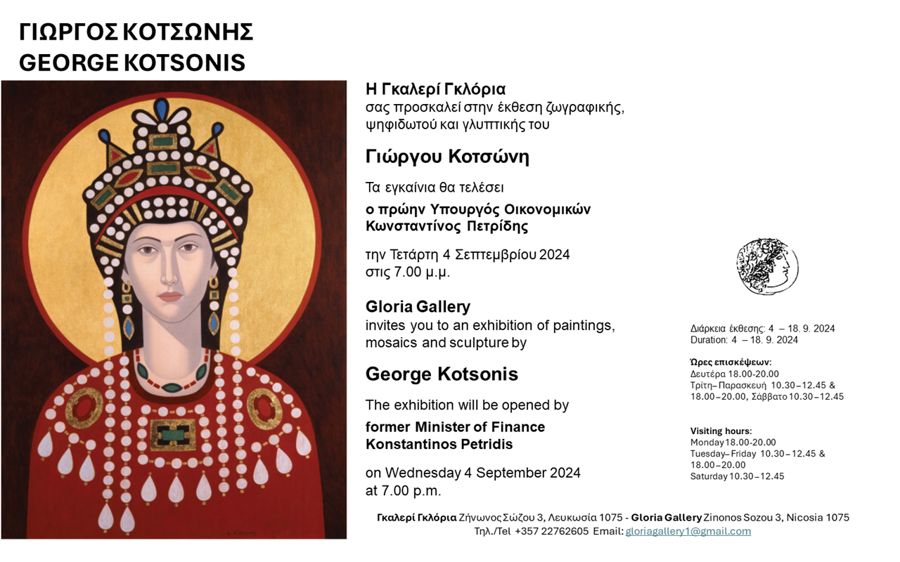 Την Τετάρτη 4 Σεπτεμβρίου 2024 και η ώρα 7.00 μ.μ. ο πρώην Υπουργός Οικονομικών κος Κωνσταντίνος Πετρίδης θα εγκαινιάσει την νέα έκθεση ζωγραφικής του Γιώργου Κοτσώνη στην Γκαλερί Γκλόρια και μαζί με αυτή τη νέα σαιζόν εκθέσεων για το Φθινόπωρο - Χειμώνα 2024.