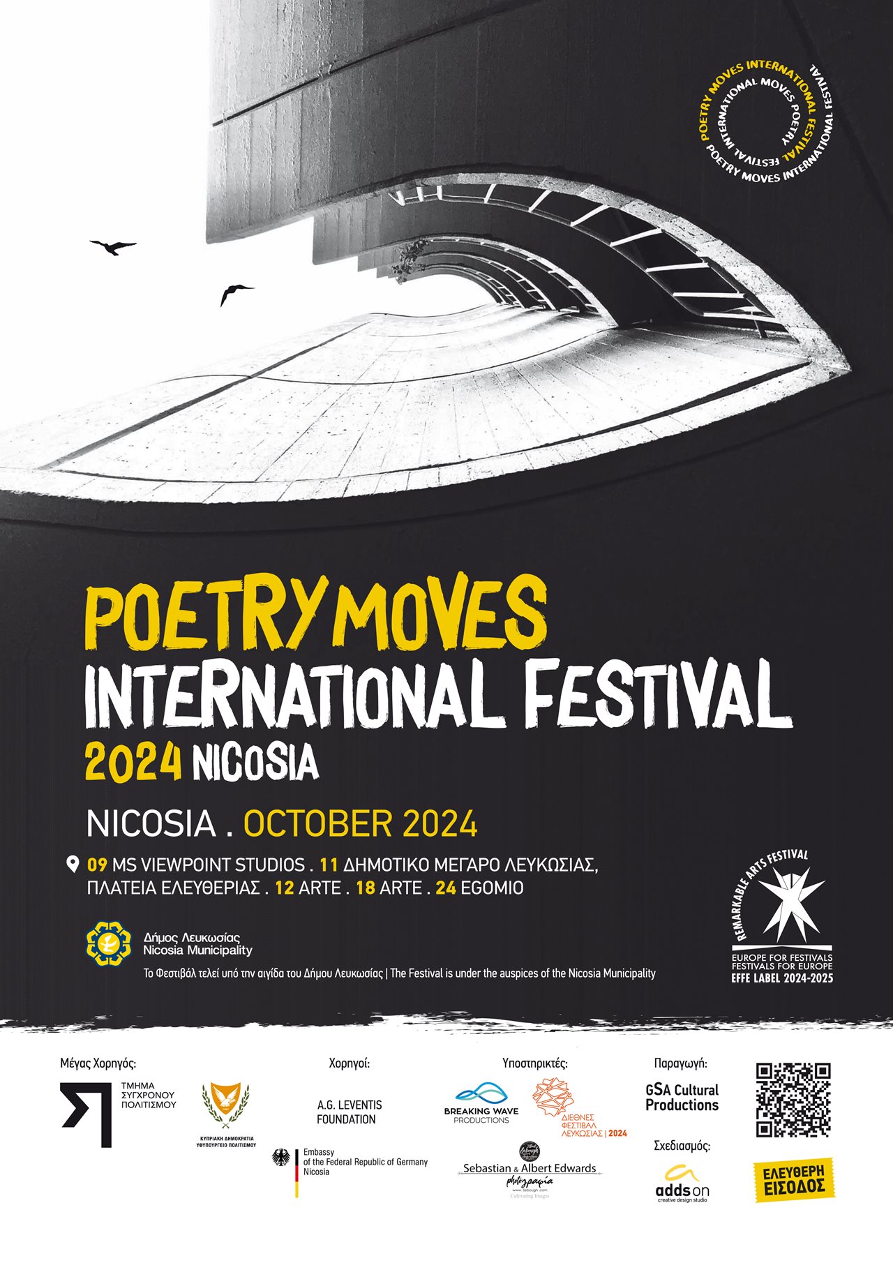 Οι ποιητές του POETRY MOVES INTERNATIONAL FESTIVAL 2024: Johann Wolfgang von Goethe, Κωνσταντίνος Καβάφης, Christian Morgenstern, Rainer Maria Rilke, Fernando Pessoa, Anna Akhmatowa, Hilde Domin, Γιάννης Ρίτσος, Antonia Pozzi, Μίλτος Σαχτούρης, Sylvia Plath, Χρίστος Λάσκαρης, Κώστας Μόντης, Μιχάλης Πασιαρδής, Κυριάκος Χαραλαμπίδης, Νίκος Ορφανίδης, Νίκη Κατσαούνη, Μόνα Σαββίδου-Θεοδούλου, Έλενα Συμεού Γεωργίου, Ρωξάνη Νικολάου, Δάφνη Νικήτα, Σταύρος Ξ. Πέτρου και Ειρήνη Αγγελίνα.