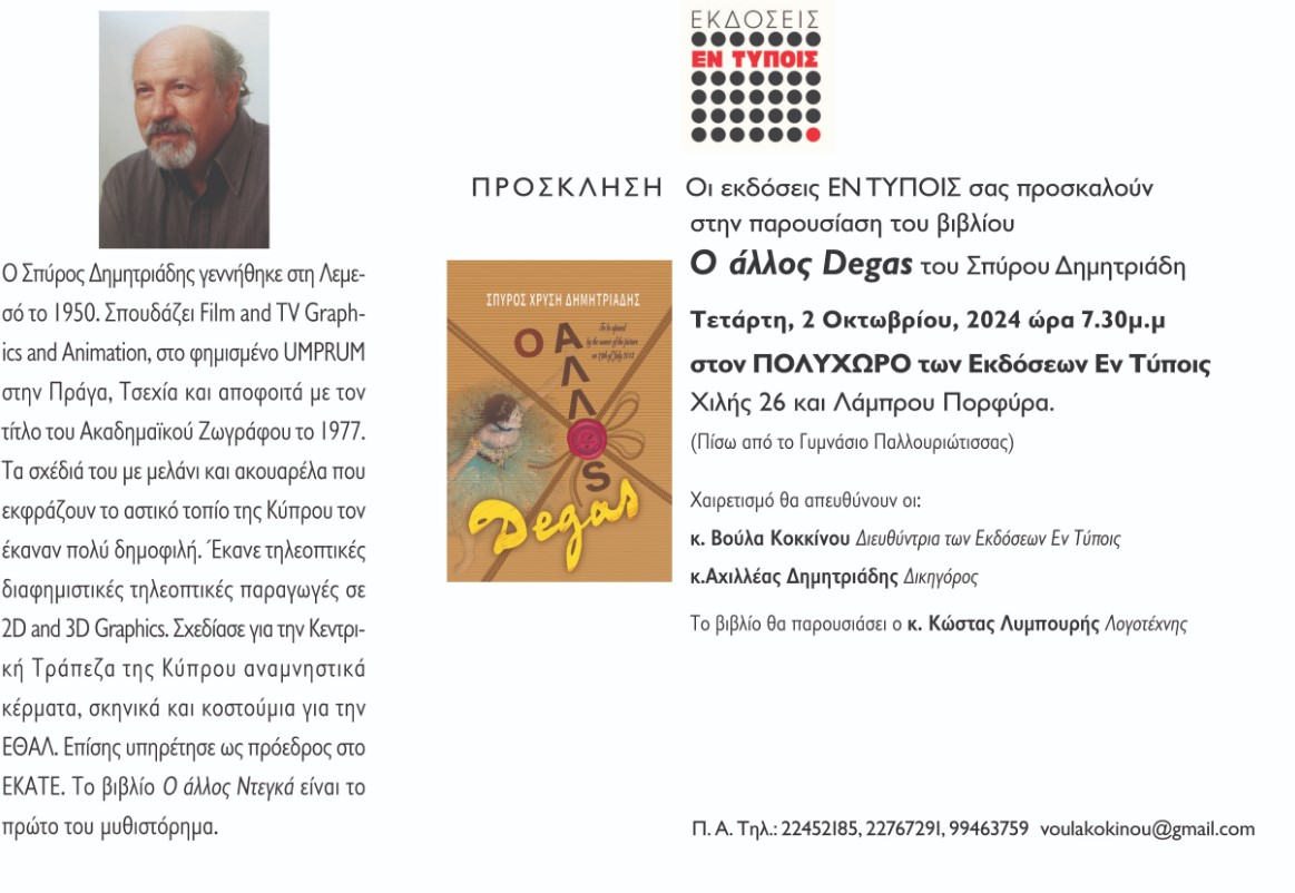 Ο άλλος Degas του Σπύρου Δημητριάδη την Τετάρτη 2 Οκτωβρίου 2024, ώρα 7:30μ.μ. στον Πολυχώρο των Εκδόσεων Εν Τύποις, οδός Χιλής 26 και Λάμπρου Πορφυρά. (πίσω από Γυμνάσιο Παλουριώτισσας)