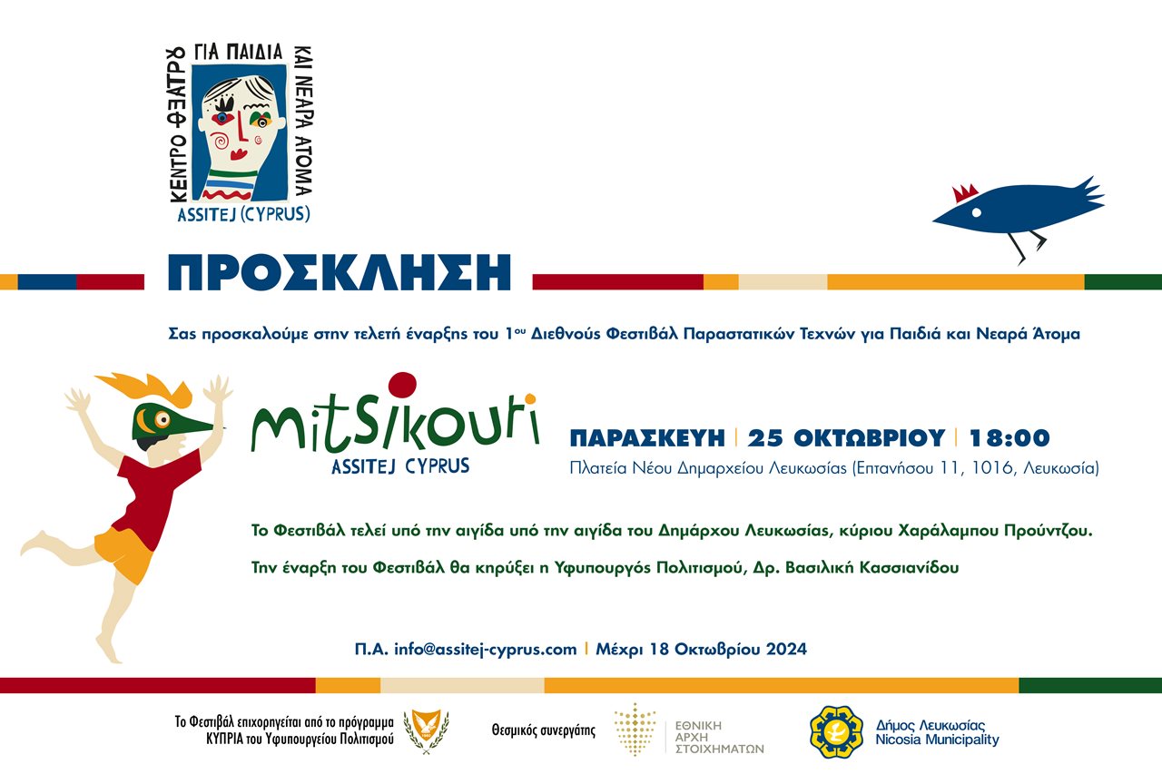 To 1ο Διεθνές Φεστιβάλ Παραστατικών Τεχνών για Παιδιά και Νεαρά Άτομα Mitsikouri, που διοργανώνεται από το Κέντρο Θεάτρου για Παιδιά και Νεαρά Άτομα - ASSITEJ Κύπρου, θα φιλοξενήσει 11 υψηλού επιπέδου παραστάσεις θεάτρου, χορού και μουσικής για παιδιά, από 10 χώρες: Ολλανδία, Ιταλία, Ισπανία, Κύπρος, Λιθουανία, Ιρλανδία, Ηνωμένο Βασίλειο, Ελλάδα, Ισλανδία και Φινλανδία. Στο πρόγραμμα περιλαμβάνονται παραστάσεις για όλες τις ηλικίες παιδιών, από 0 μέχρι 18 ετών.