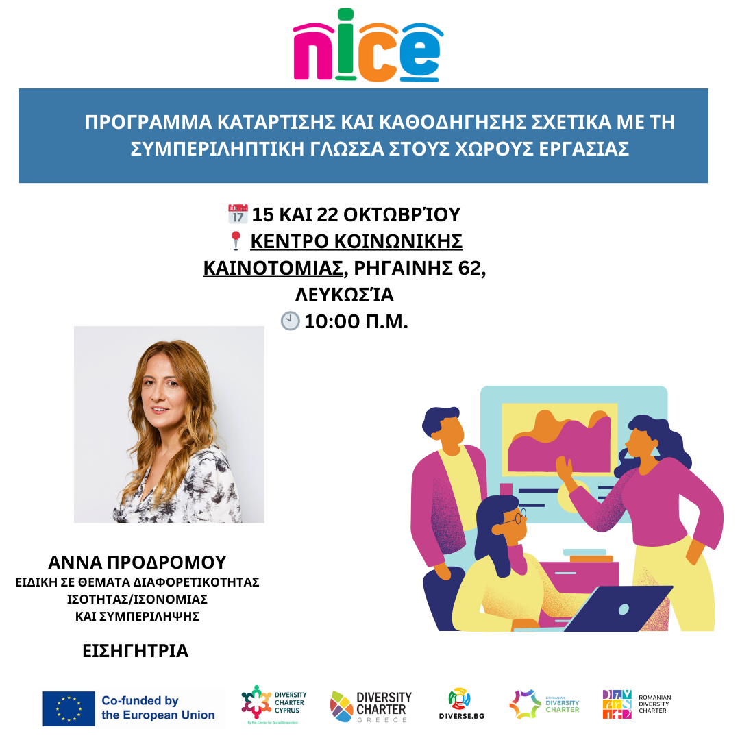 Με χαρά σας καλωσορίζουμε στο NICE Project: Πρόγραμμα Κατάρτισης και καθοδήγησης σχετικά με τη συμπεριληπτική γλώσσα στους χώρους εργασίας, υπό την αιγίδα του Diversity Charter Cyprus.