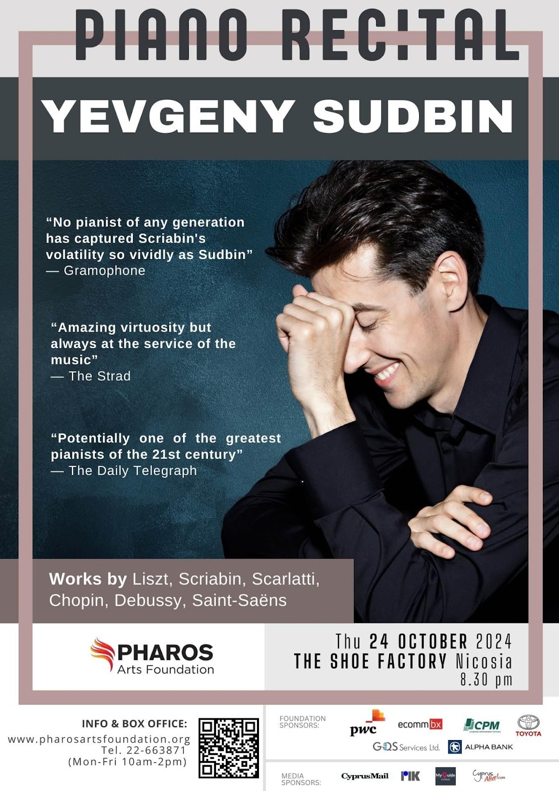 Καταξιωμένος για την άψογη τεχνική και τη δεξιοτεχνία του, το συναισθηματικό του βάθος και τη διαίσθησή του, ο διεθνούς φήμης πιανίστας Yevgeny Sudbin επιστρέφει στην Κύπρο μετά από έξι χρόνια για μια μοναδική συναυλία που διοργανώνει το Ίδρυμα Τεχνών Φάρος. Ο Sudbin έχει χαιρετισθεί από την εφημερίδα Telegraph ως «πιθανότατα ένας από τους σπουδαιότερους πιανίστες του 21ου αιώνα» και εμφανίζεται στις σπουδαιότερες συναυλιακές αίθουσες και σειρές συναυλιών ανά το παγκόσμιο, συνεργαζόμενος με σημαίνοντες μαέστρους όπως οι Νέεμε Γιάρβι, Σαρλ Ντυτουά, Βλαντιμίρ Ασκενάζι, Όσμο Βάνσκα, και Βασίλι Σινάισκι, μεταξύ πολλών άλλων. Με τις ερμηνείες του να έχουν περιγραφεί ως «καθηλωτικές» και «βαθιά συγκινητικές», ο Sudbin έχει εδραιωθεί ως «ένας πιανίστας σπάνιας ευαισθησίας και φινέτσας, που έχει απόλυτη αυτοπεποίθηση στη νοερή έννοια που δημιουργεί για κάθε κομμάτι», ενώ το περιοδικό BBC Music Magazine τον περιέγραψε ως «ένα συνδυασμό της ηφαιστειακής έντασης του Βλαντιμίρ Χόροβιτς με τα τονικά αντανακλαστικά του Μιχαήλ Πλετνιόφ». Για το πολυαναμενόμενο ρεσιτάλ του στις 24 Οκτωβρίου 2024, στο The Shoe Factory, Λευκωσία / 8:30μμ, ο Yevgeny Sudbin θα δώσει άλλη μια αξεπέραστη ερμηνεία, σε έργα των Λιστ, Σκριάμπιν, Σκαρλάτι, Σοπέν, Ντεμπισί, και Σεν-Σανς.