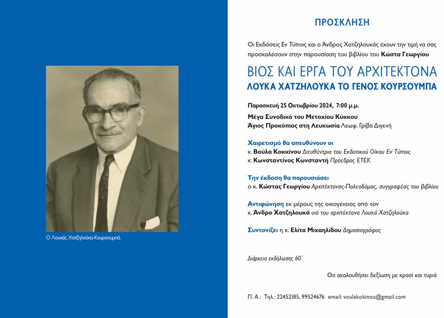 ΕΝΗΜΕΡΩΣΗ / Εκδηλώσεις / Εκδηλώσεις / Εκδηλώσεις 2024 / Οκτώβριος / Παρουσίαση βιβλίου - Βίος και έργα του Αρχιτέκτονα Λουκά Χατζηλούκα το Γένος Κουρσουμπά