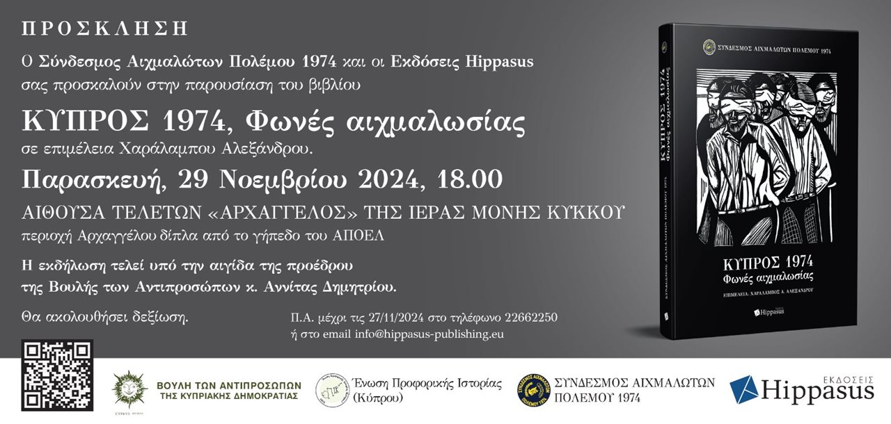 Ο Σύνδεσμος Αιχμαλώτων Πολέμου 1974 και οι Εκδόσεις Hippasus σας προσκαλούν στην παρουσίαση του βιβλίου ''ΚΥΠΡΟΣ 1974, Φωνές αιχμαλωσίας''.