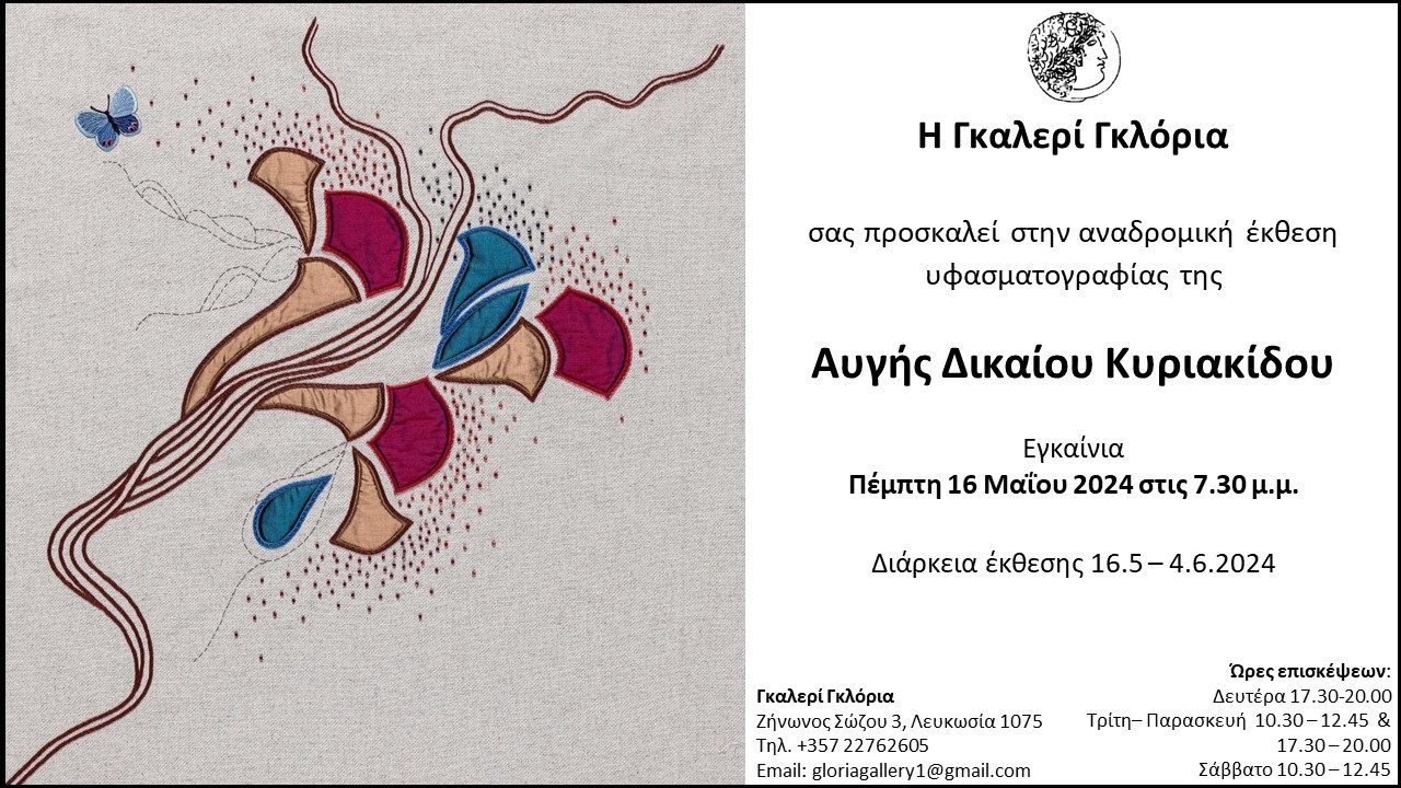 Αυγής Δικαίου Κυριακίδου. Τα εγκαίνια της έκθεσης θα πραγματοποιηθούν την Πέμπτη 16 Μαΐου 2024 στις 7.30 μ.μ.