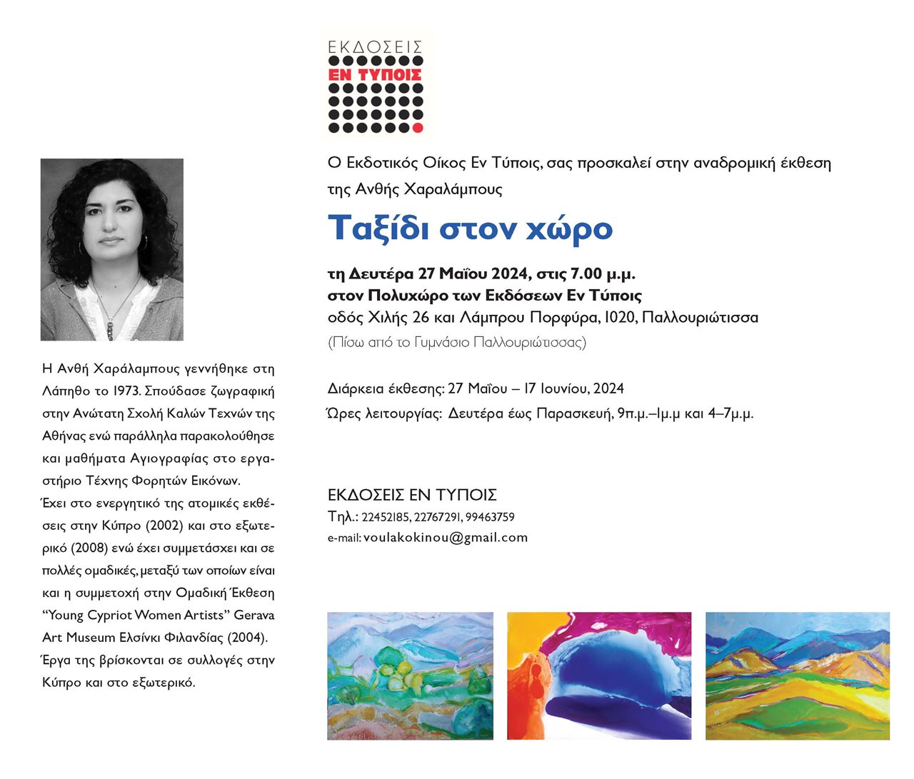 Ο Εκδοτικός Οίκος Εν Τύποις, σας προσκαλεί στην αναδρομική έκθεση της Ανθής Χαραλάμπους Ταξίδι στον χώρο τη Δευτέρα 27 Μαΐου 2024, στις 7:00 στον Πολυχώρο των Εκδόσεων Εν Τύποις, οδός Χιλής 26 και Λάμπρου Πορφύρα, 1020, Παλλουριώτισσα (πίσω από το Γυμνάσιο Παλλουριώτισσας)
