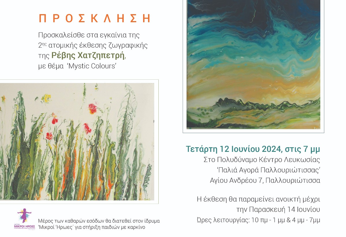 Προσκαλείστε στα εγκαίνια της 2ης ατομικής έκθεσης ζωγραφικής της Ρέβη Χατζηπετρή με θέμα Mystic Colours την Τετάρτη 12 Ιουνίου 2024, στις 19:00 στην Παλιά Αγορά Παλλουριώτισσας, Αγίου Ανδρέου 7.